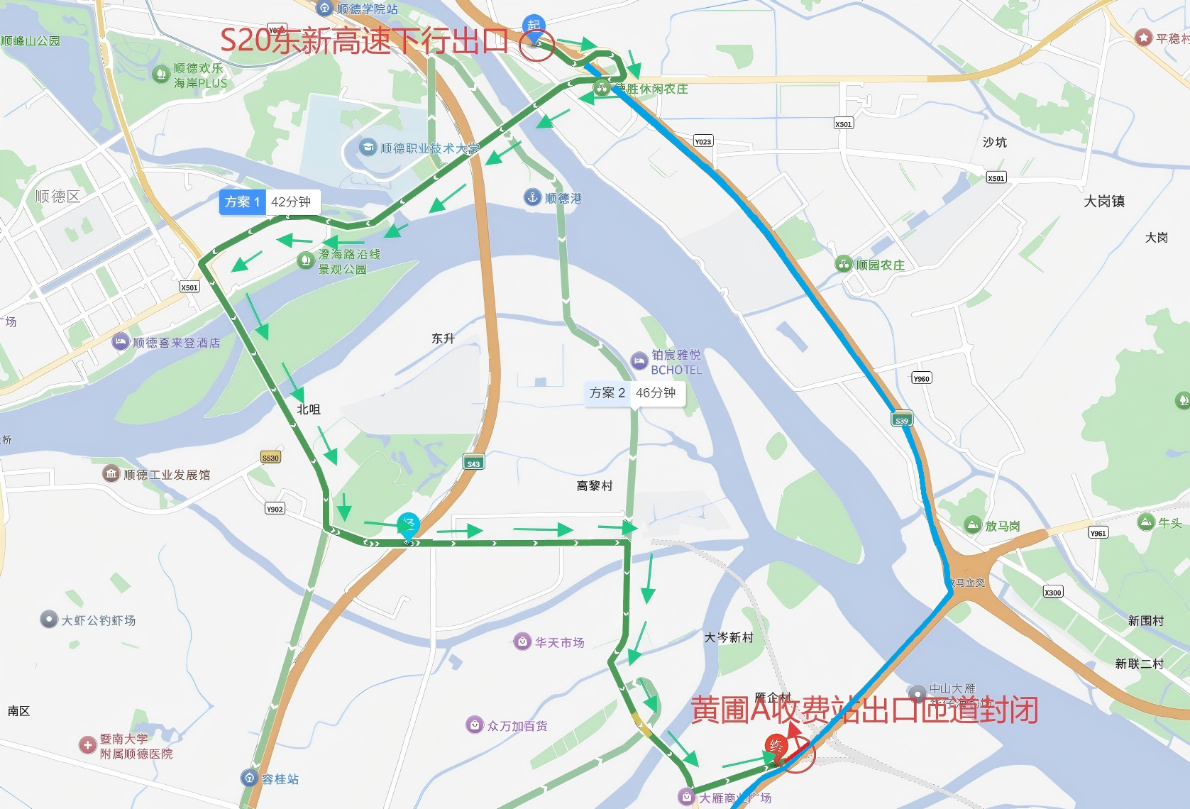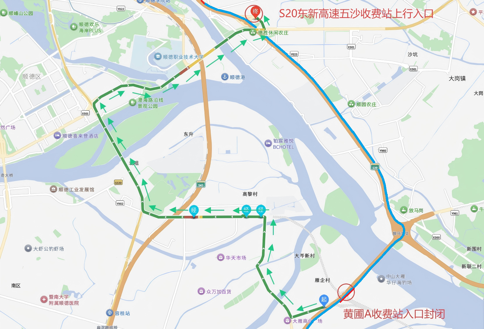 需由黄圃A收费站进入广中江高速(往广州方向)的车辆,可通过地方道路行驶绕行至五沙收费站进入东新高速后,按目的地选择实际行驶路线,可西向行驶往东沙方向,东向行驶往新联方向(地方道路绕行路线:大雁圃灵路→外环路→建业中路→顺德快速→德胜东路→五沙收费站)。