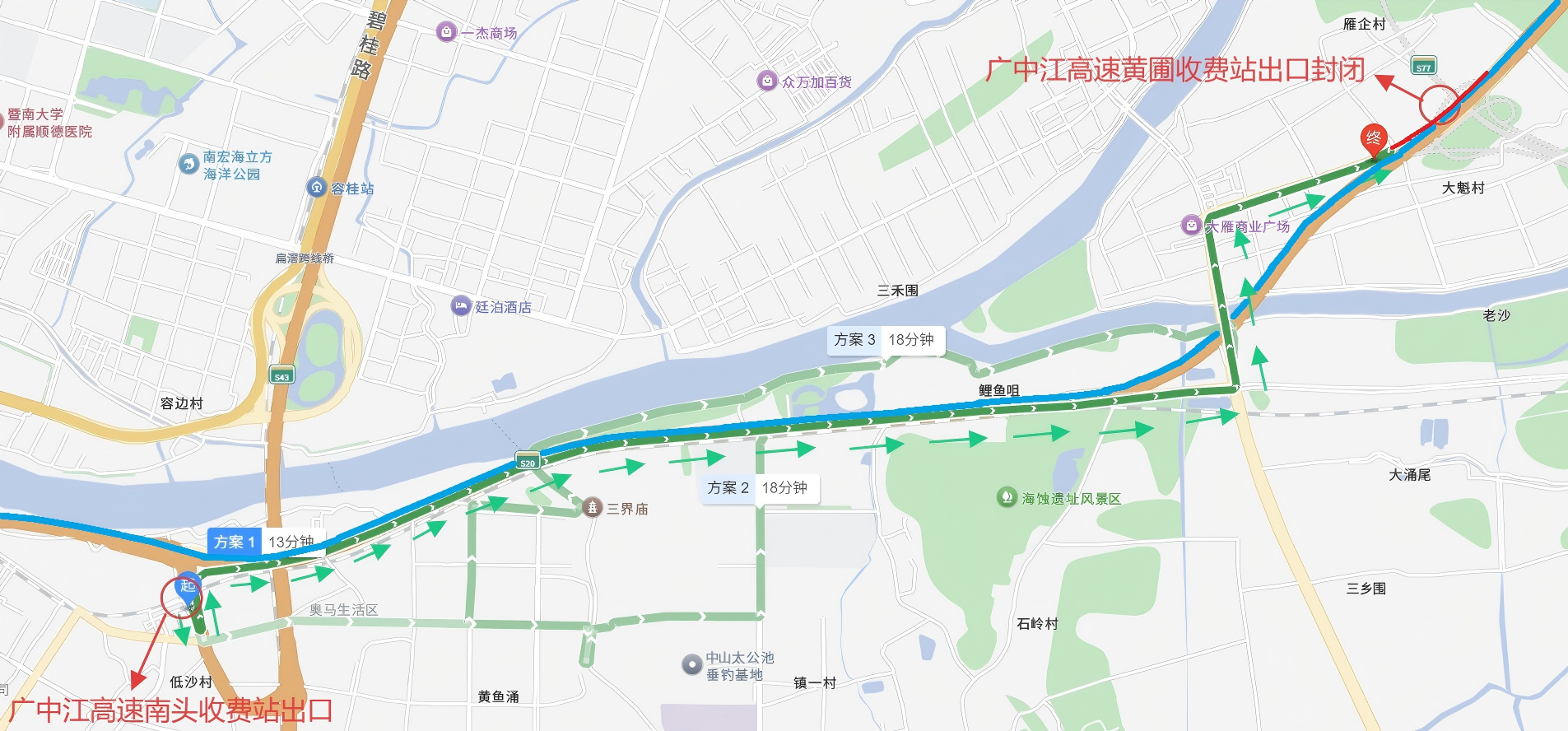 2.当车辆从广中江高速往江门方向行驶时,需行至南头北收费站下高速,通过地方道路绕行至中山黄圃镇圃灵路(地方道路引流路线:广中江高速(往江门方向)→南头北收费站出口→岭栏路→大雁路→大雁圃灵路)。