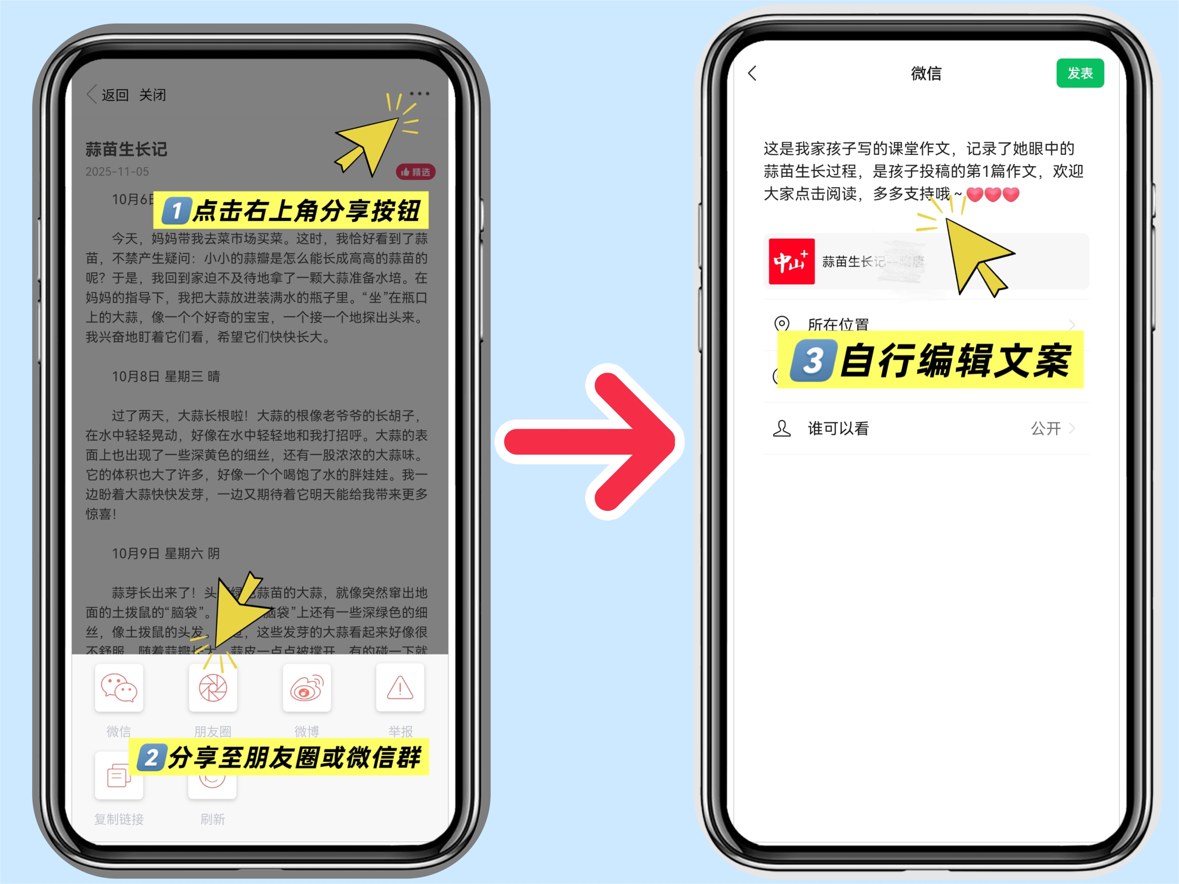 技巧一:稿件审核通过后,点击作品页面右上角“分享”按钮,将孩子的作品链接,转发到家庭群、班级群、朋友圈。转发时可以加上一句暖心文案,比如“这是我家孩子写的课堂作文,记录了她眼中的蒜苗成长过程,是孩子投稿的第一篇作文,欢迎大家点击阅读~”,更容易吸引亲友点击。