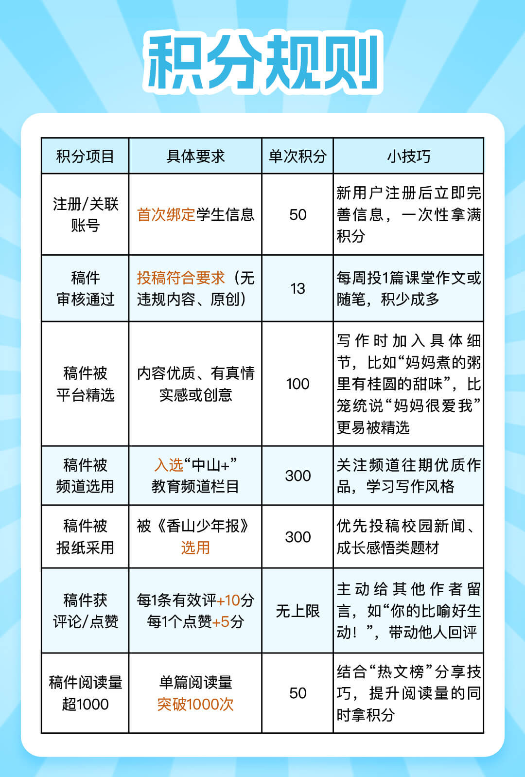 “积分月榜”拼的是“创作活跃度+作品质量”,每月积分排名前10的小作者直接上榜。我们整理了清晰的积分规则表,帮你吃透规则,快速攒分。进入“积分月榜”的孩子,将获得稿费+月度人气小作者证书。