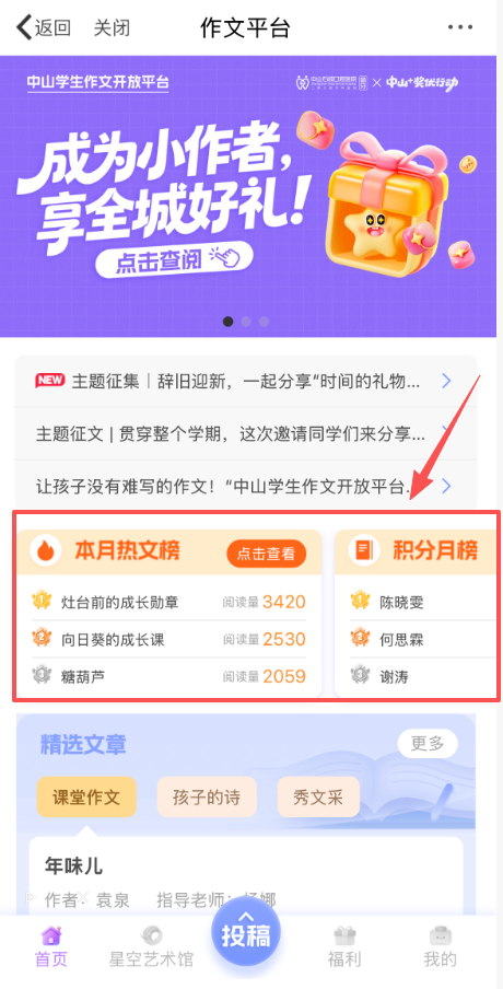 额外曝光:上榜作品将被展示在平台“热文榜单”专区,让更多同学、老师甚至家长看到孩子的才华。