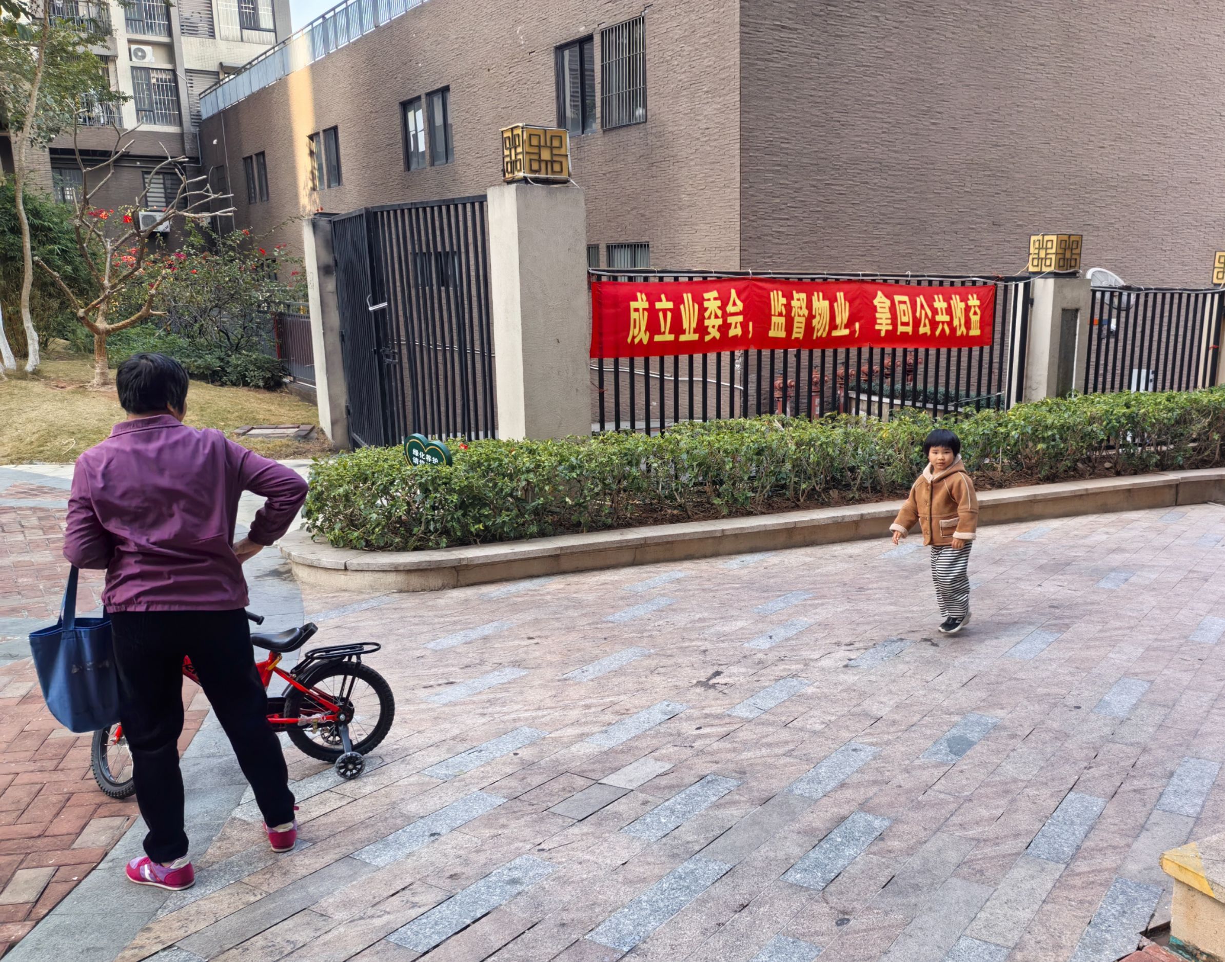 颇具戏剧性的是,在小区公共区域,数条红色横幅赫然在目。“投下您神圣的一票,共建美好新家园”“成立业委会,监督物业,拿回公共收益”等标语直接明了。