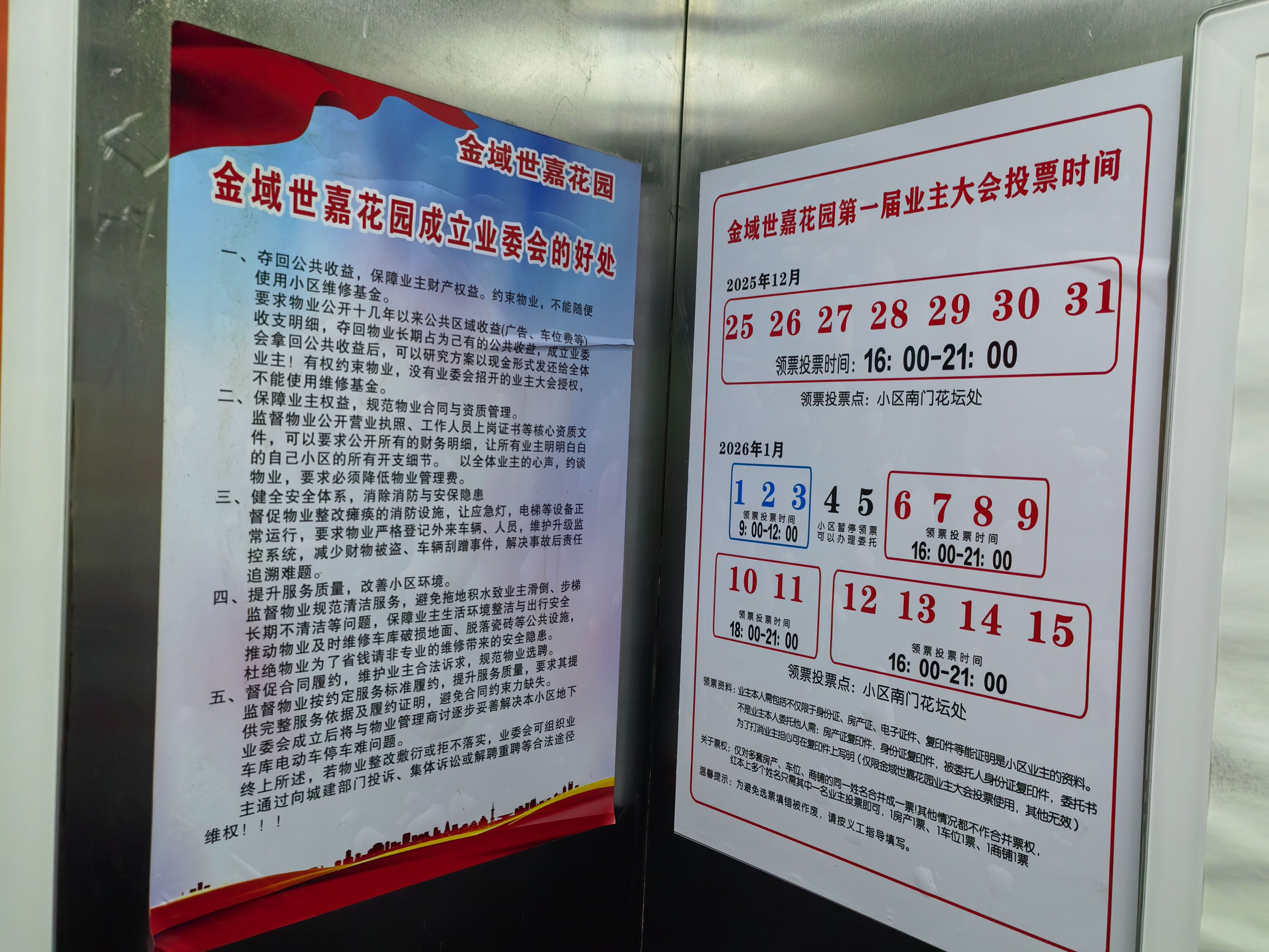 同时,筹备组还贴了《金域世嘉花园成立业委会的好处》宣传材料,将成立业委会的目标具体化、公开化:追索被长期占用的公共区域收益(广告、车位费等)并研究现金返还方案;监督物业公开资质与财务,推动降低物业费;通过合法途径解决地下车库等历史遗留问题。