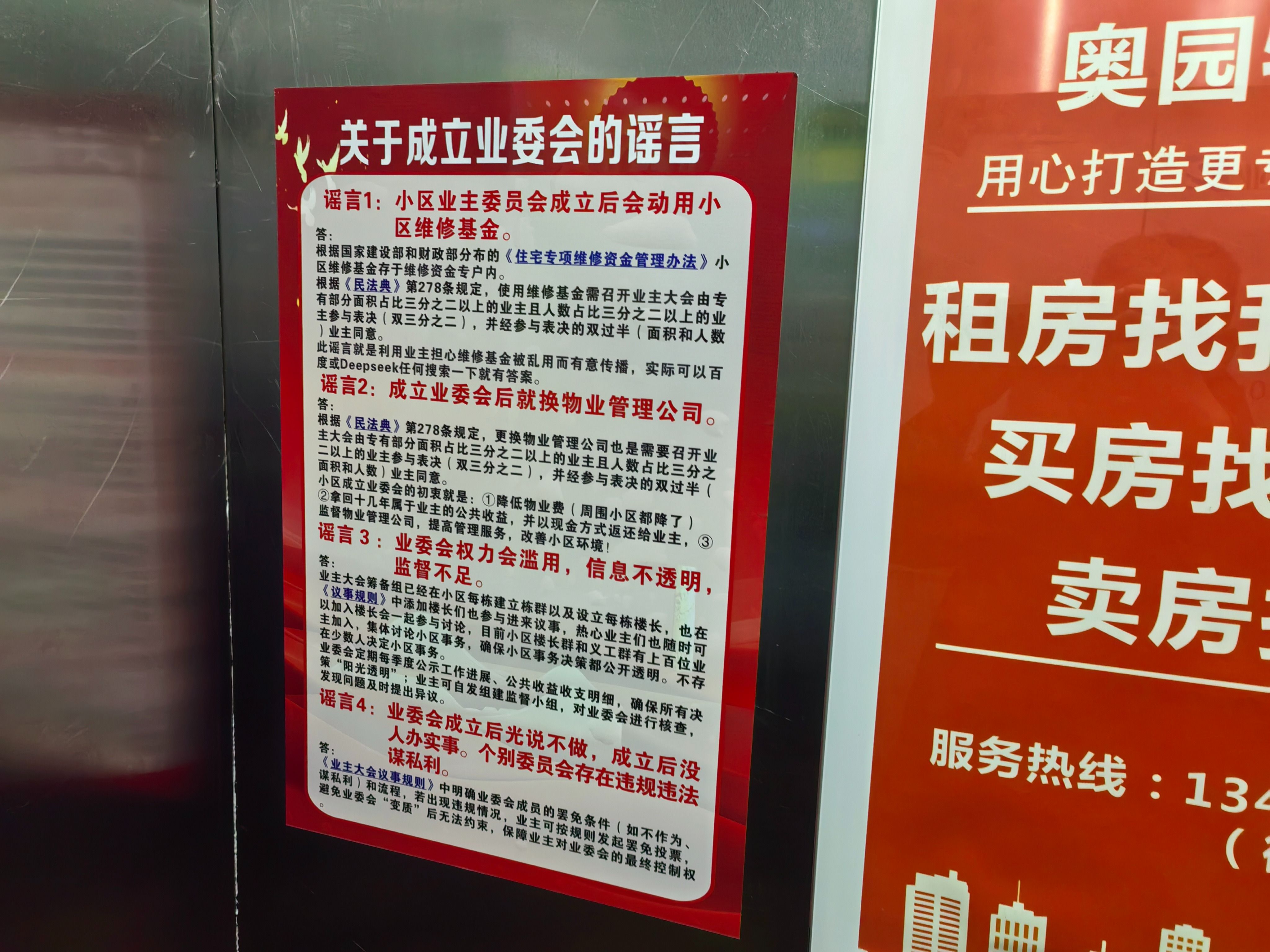 面对传言,小区业委会筹备组迅速行动。记者在电梯内看到了筹备组张贴的《关于成立业委会的谣言》声明,有针对性地驳斥了诸如“成立业委会后就换物业”等不实信息。声明援引《中华人民共和国民法典》指出,更换物业须经法律规定的严格程序,绝非业委会能擅自决定。