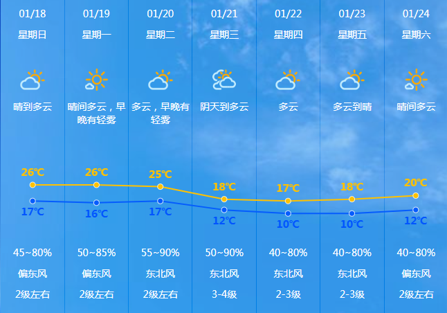 预计18-20日我市晴到多云,早晚有轻雾,天气温暖舒适;