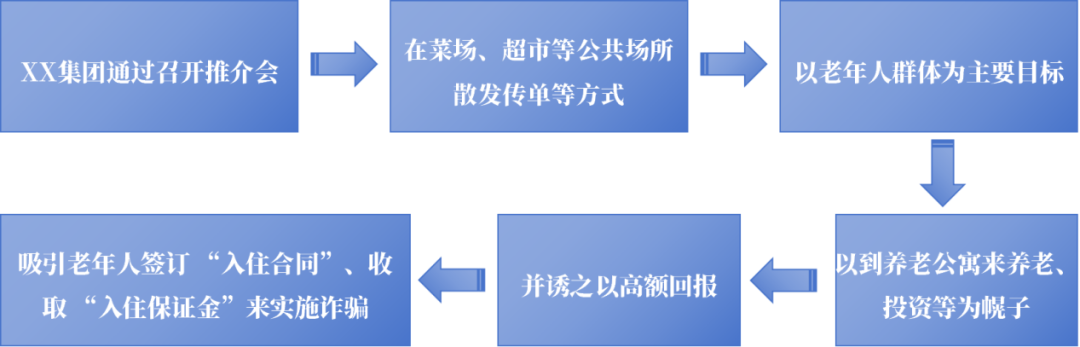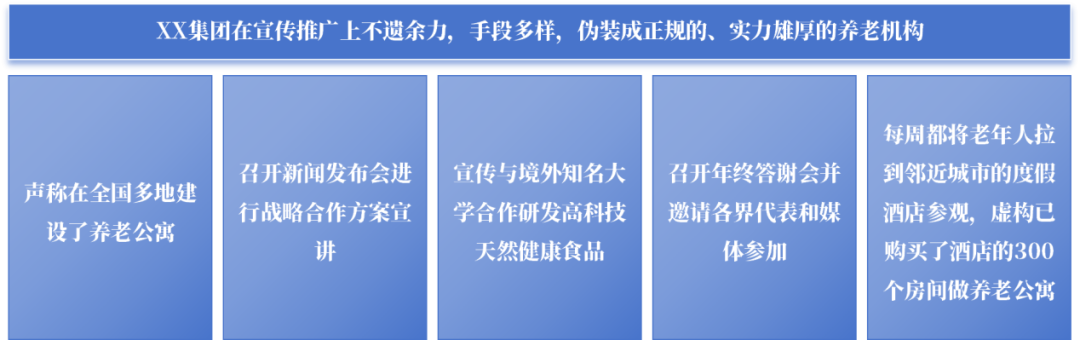 “公寓养老”“投资养老”是不法分子针对老年人进行集资诈骗的常见手段之一,该案涉案金额特别巨大,严重扰乱了金融秩序,侵害了老年人的合法权益,造成了恶劣的社会影响。不法分子着力于“立体式”宣传,伪造实力雄厚的假象,谎称上市公司,甚至在互联网发布核心团伙成员集体亮相境外上市地拉宣传横幅的照片,具有很强的迷惑性,达到了扩大集资规模、延缓案发的目的。老年人常有“老有所依、老有所养”的观念,容易受“以房养老”“公寓养老”的广告吸引。