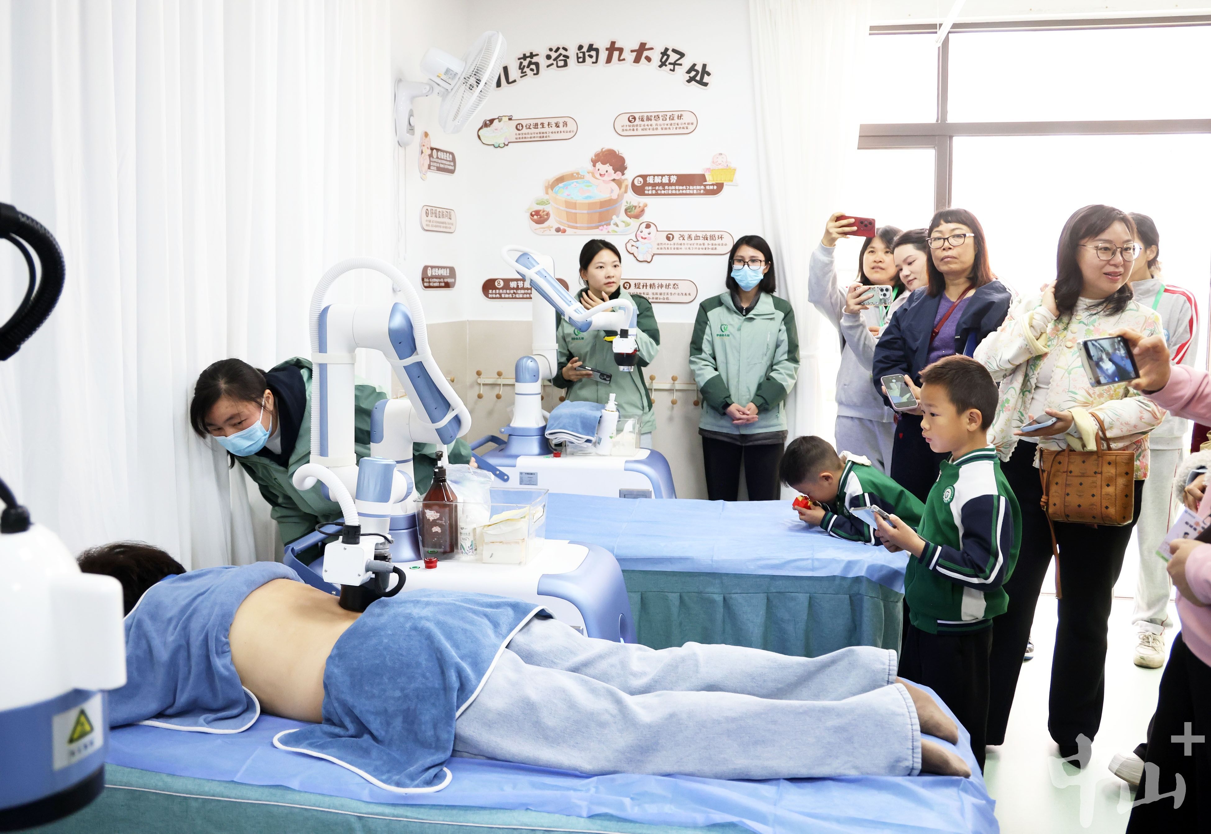 上午9时,活动正式开始。幼儿园内设置了多个医育融合体验区域,让孩子们在游戏中接触传统中医与现代科技。在趣味体验区,孩子们化身“小小中医师”,亲手熬制养生茶饮、学习简易穴位按摩手法,在实践中了解中医文化;AI中医体验馆也是人气爆棚,艾灸智能机器人、智能面舌诊仪等设备整齐摆放,孩子们亲手操作模拟艾灸、舌诊检测等项目,直观感受中医与科技的结合,拓宽了对传统医学的认识。