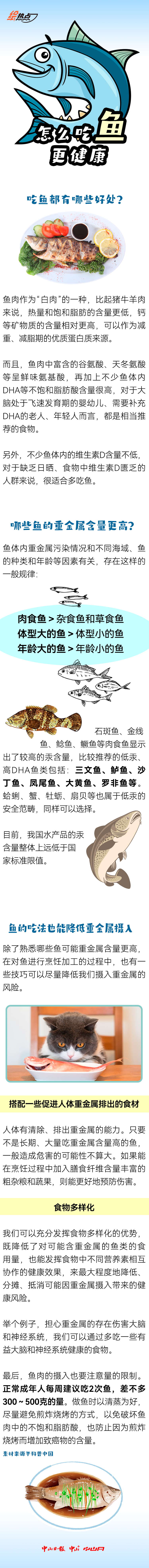 中国人喜欢吃鱼,但随着生活水平的提高,人们对饮食安全的要求也越来越高,很多人担心鱼类、水产会不会有重金属污染。鱼到底该怎么挑选、怎么吃更健康?一图读懂!