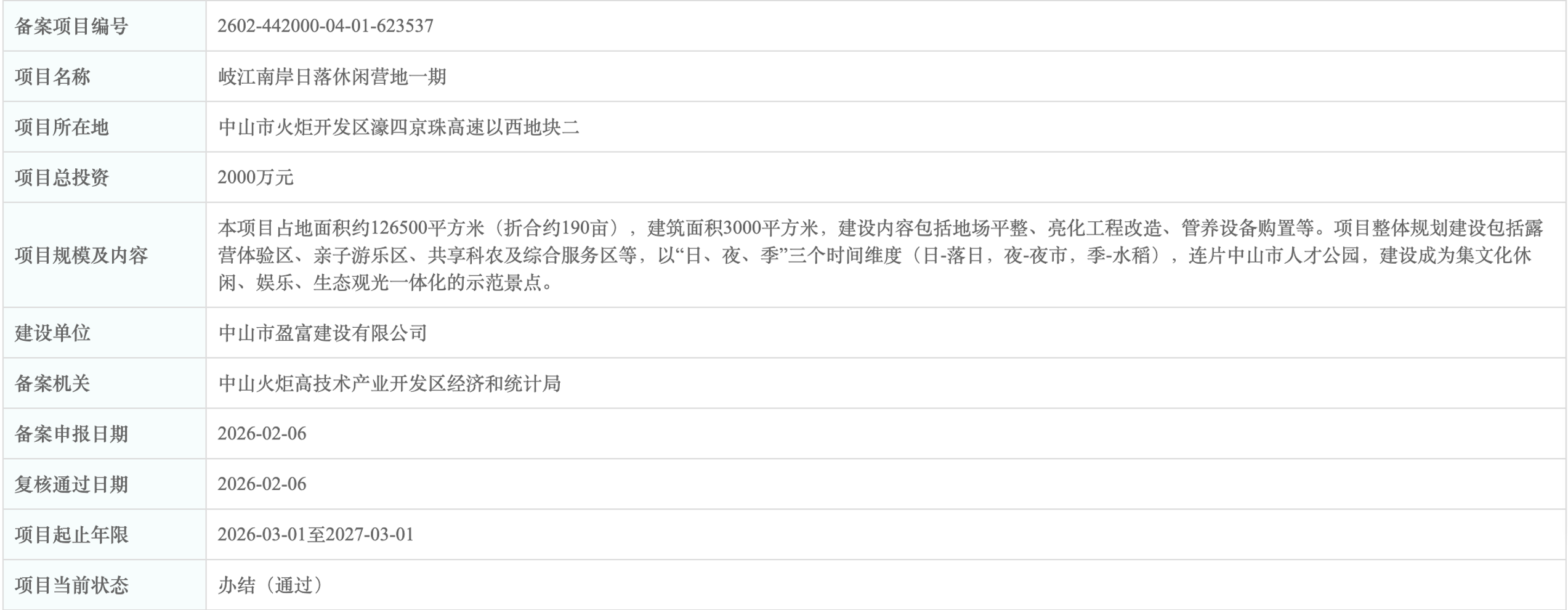 公示信息显示,项目建设单位为中山市盈富建设有限公司,备案机关为中山火炬高技术产业开发区经济和统计局。计划建设时间从2026年3月1日至2027年3月1日。