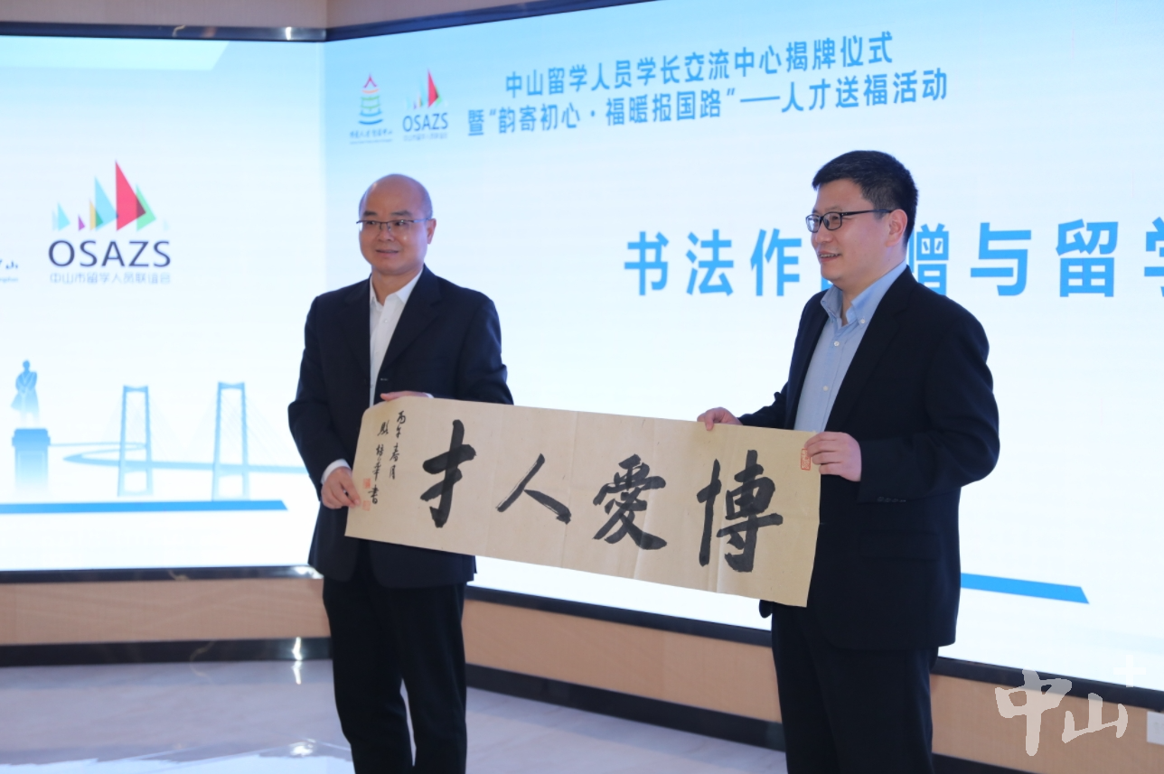 活动现场不仅有揭牌的喜悦,更有浓浓的年味与城市温情。中山市书法家协会的书法家们现场挥毫泼墨,一幅幅饱含“留学报国”“博爱人才”美好寓意的书法作品、大红春联与福字跃然纸上,由相关领导赠与留学人才代表,笔墨间传递着中山对归国人才的殷切期许与暖心关怀,让在场人才在墨香氤氲中感受着这座城市的温度。