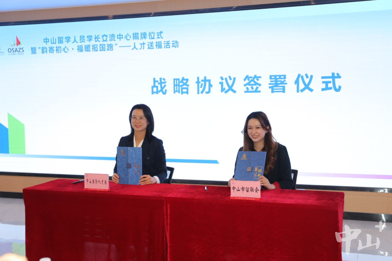 当天还举行了战略合作协议签署仪式,中山国际人才港服务中心与中山市留学人员联谊会、中山翠亨新区澳中青年创新创业园与中山香商私募股权投资基金管理有限公司分别签约,各方将在人才项目孵化、交流合作、市场拓展、金融支持等领域深度携手,为归国人才的创新创业之路提供政策、资源、空间、资金的全链条支撑,让创意落地、让梦想开花。