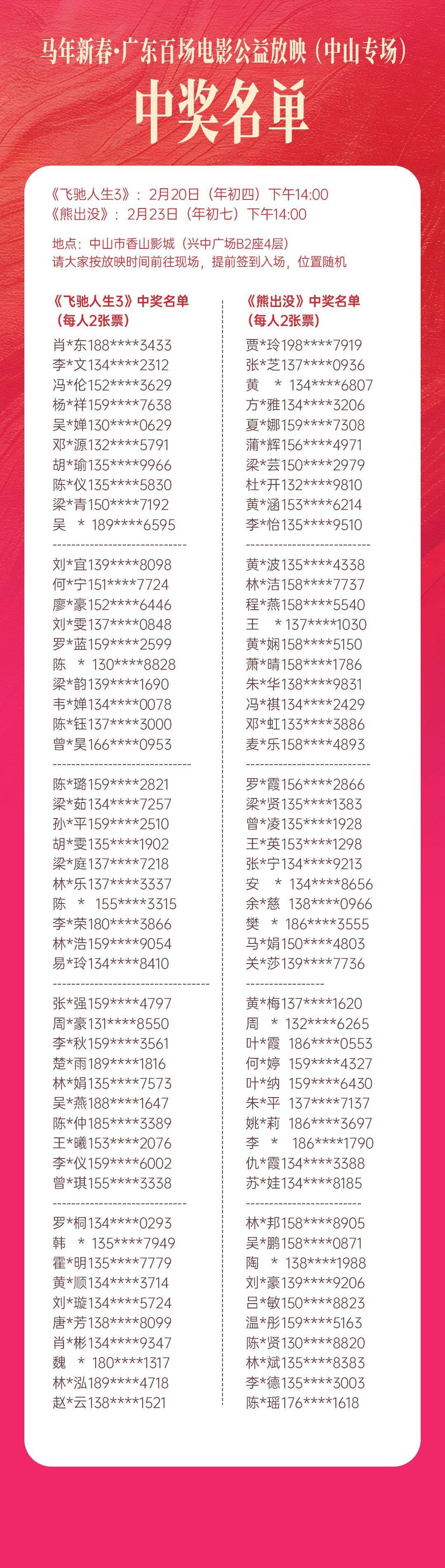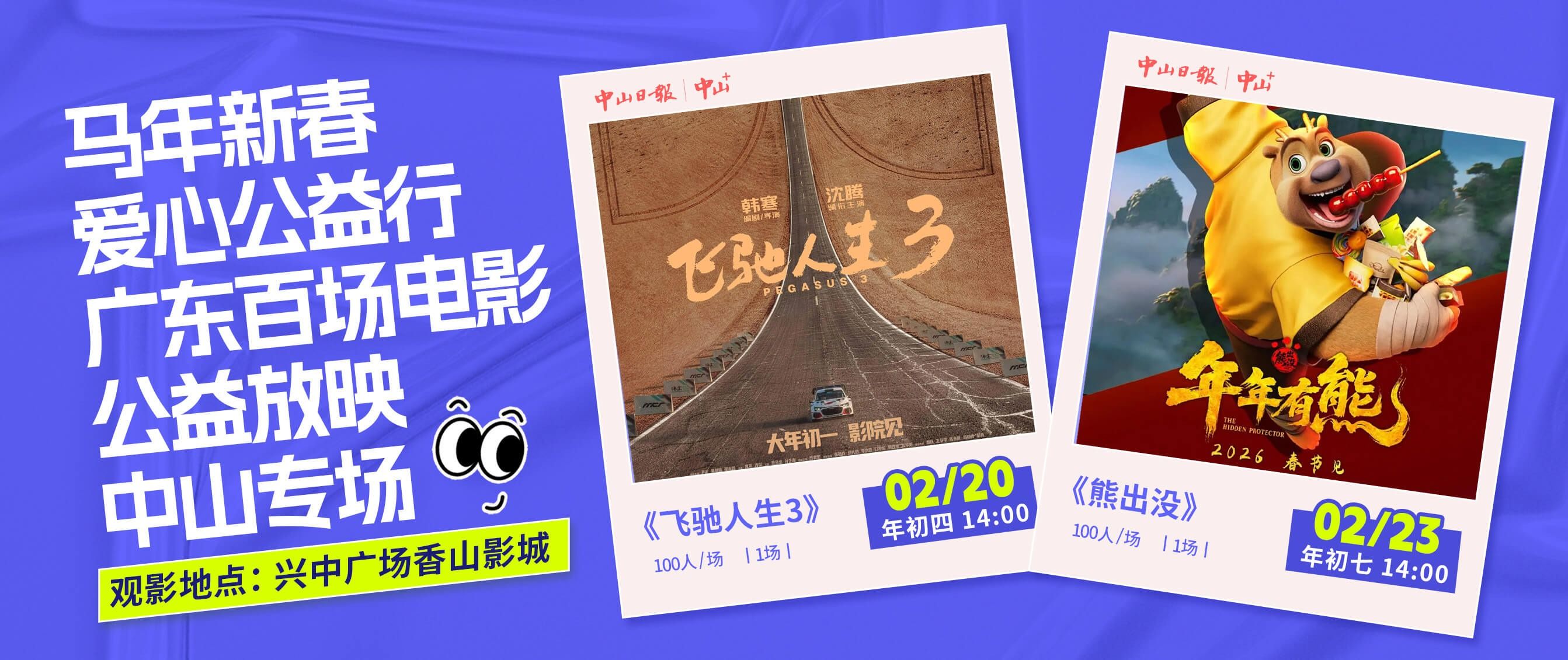 由广东省电影局指导,珠江电影集团主办,珠江影业传媒承办的 “马年新春·广东百场电影公益放映” 活动,春节假期将在中山市香山影城举行两场免费专场放映。