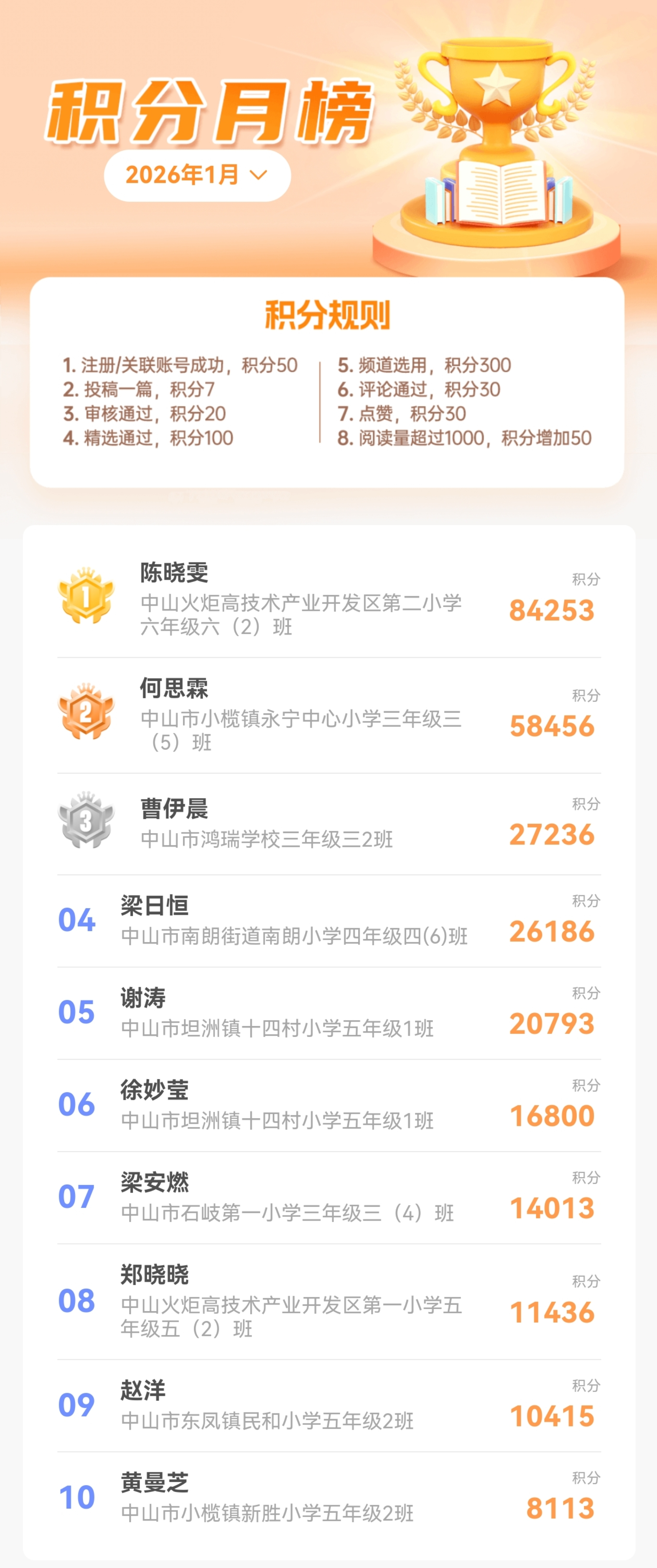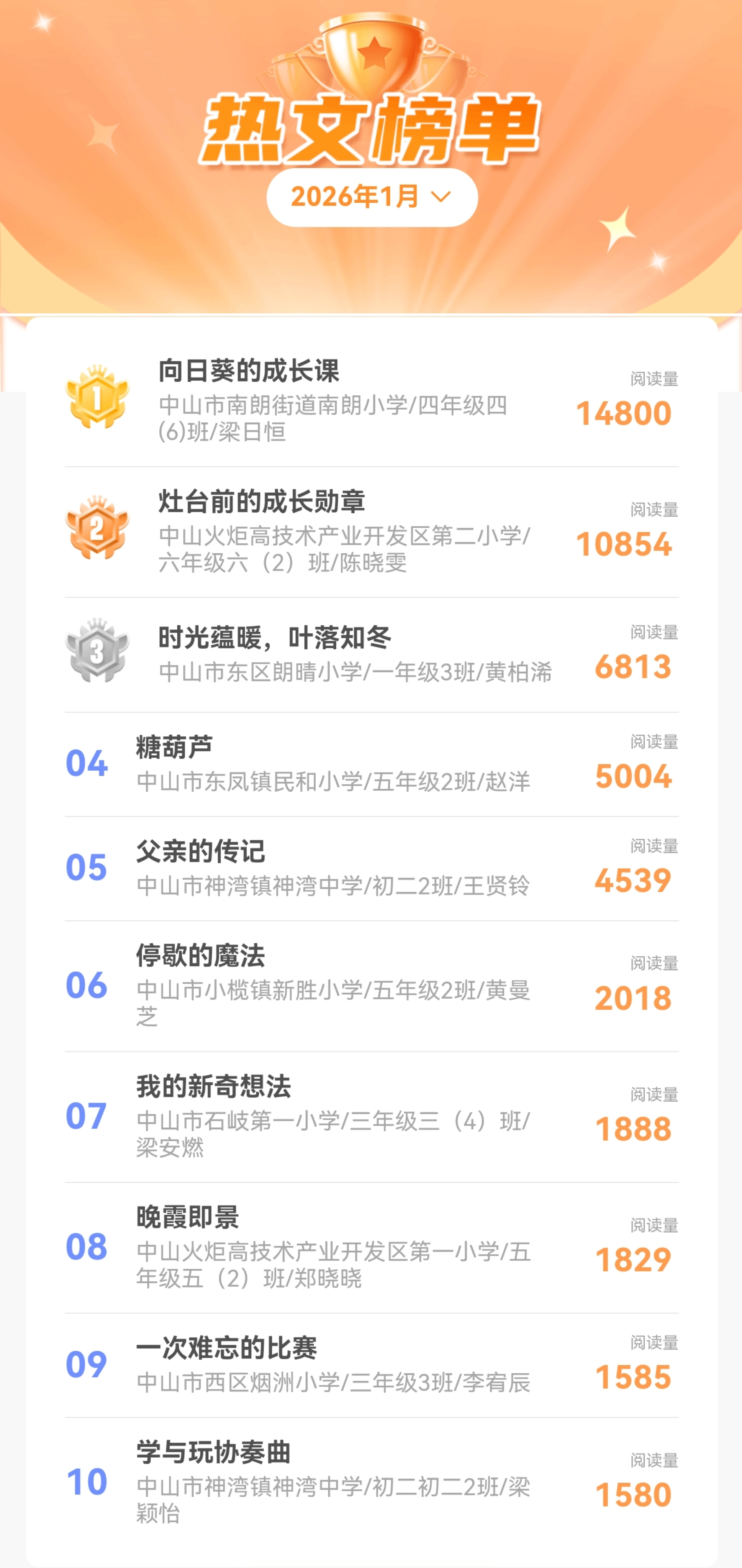 在陪伴中山学子成长的道路上,我们始终想给小作者们更多认可与鼓励。“月度热文榜”“积分月榜”不是优等生的专属,而是给所有热爱写作的孩子一个被看见、被认可的舞台——只要愿意写、愿意分享,就有机会上榜!