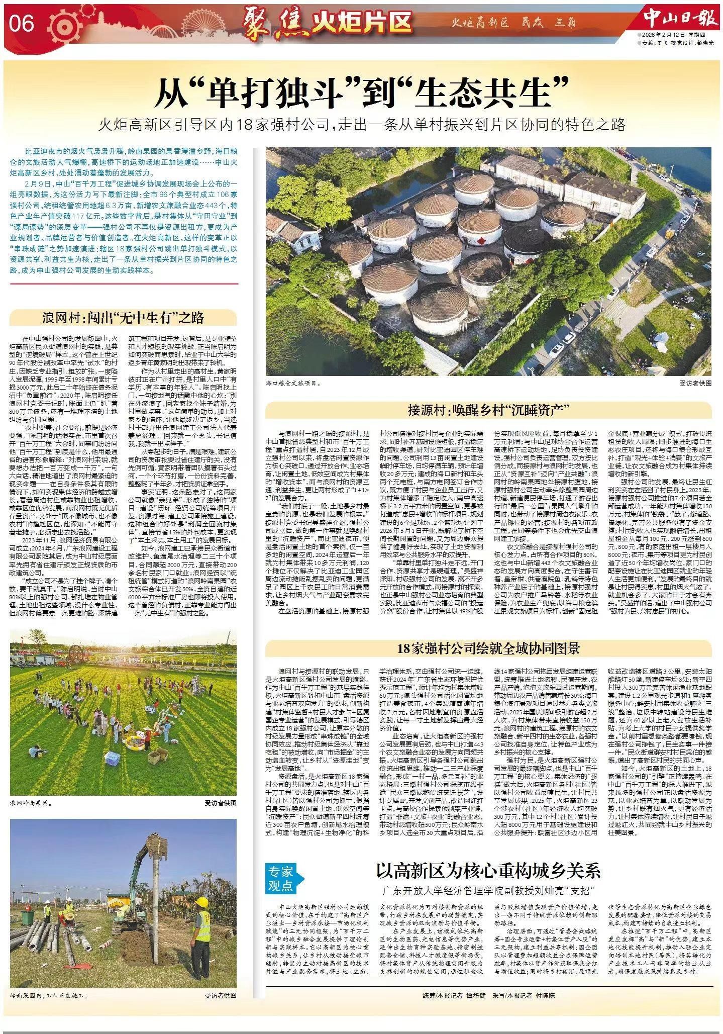 2月9日,中山“百千万工程”促进城乡协调发展现场会上公布的一组亮眼数据,为这份活力写下最新注脚:全市96个典型村成立106家强村公司,统租统管农用地超6.3万亩,新增农文旅融合业态443个,特色产业年产值突破117亿元。这些数字背后,是村集体从“守田守业”到“谋局谋势”的深层变革——强村公司不再仅是资源出租方,更成为产业规划者、品牌运营者与价值创造者。在火炬高新区,这样的变革正以“串珠成链”之势加速演进:辖区18家强村公司跳出单打独斗模式,以资源共享、利益共生为核,走出了一条从单村振兴到片区协同的特色之路,成为中山强村公司发展的生动实践样本。