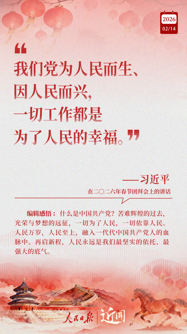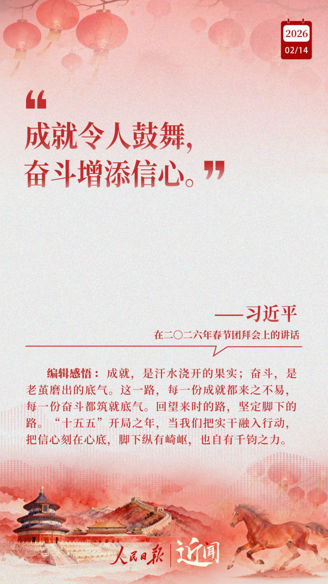 春暖情长,新春又至。2月14日,腊月廿七,习近平总书记在二〇二六年春节团拜会上发表重要讲话。“一步一个脚印坚定朝前走”“一切工作都是为了人民的幸福”“在中国式现代化新征程上策马扬鞭、勇往直前”……送祝福、话成就、谈未来,“十五五”开局起步之际,总书记这些暖心话饱含深意。