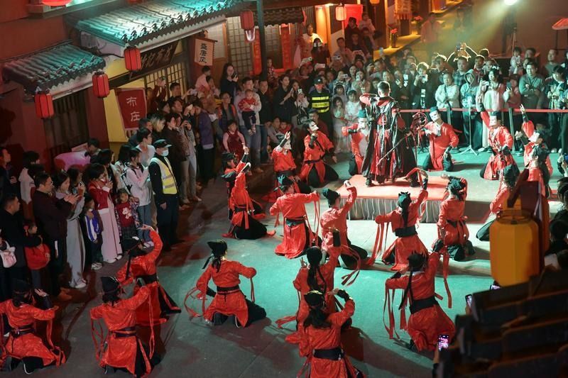 这边篝火与铁花的热闹尚未消散,长安街的非遗傩舞祈福表演又吸引了大批游客慕名而来。20时50分,戴着傩舞面具的演员们登场,用古朴刚劲的舞姿演绎着古老的祈福舞蹈,一招一式都饱含着对新年的美好期许。