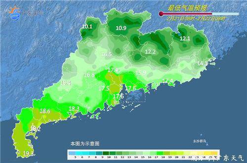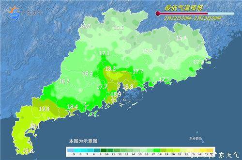 22日(初六),韶关、清远和肇庆市县多云间阴天,有小雨,其余市县多云间阴天,局部有零星小雨,大部市县早晚有(轻)雾。早晨最低气温:粤西和珠江三角洲中南部市县17~20℃,其余大部市县13~16℃。
