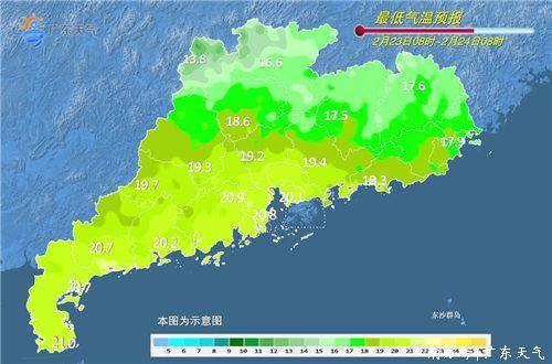 23日(初七),肇庆北部、粤北偏北和粤东沿海市县多云到阴天,有分散小雨,其余市县多云间阴天,局部有零星小雨,大部市县早晚有(轻)雾。早晨最低气温:粤西沿海和珠江三角洲中南部市县17~20℃,其余大部市县14~16℃。