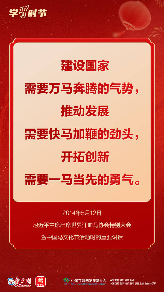 习近平总书记多次用“龙马精神”“马到功成”“一马当先”等耳熟能详的成语,向全国各族人民送上最美好的新春祝福,寄予奋进向上的殷殷嘱托。马年新春,来接收总书记的祝福和寄语,一起策马扬鞭,奔向更美好的明天!