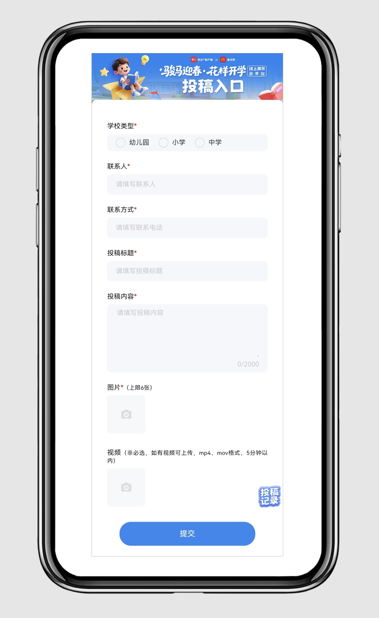 点击上方投稿按钮进入投稿界面,按要求填写表单、上传素材,简单快捷完成投稿。创意开学仪式、开学第一课、特色校园布置、暖心师生互动等均可投稿,记得配上清晰图片或短视频。