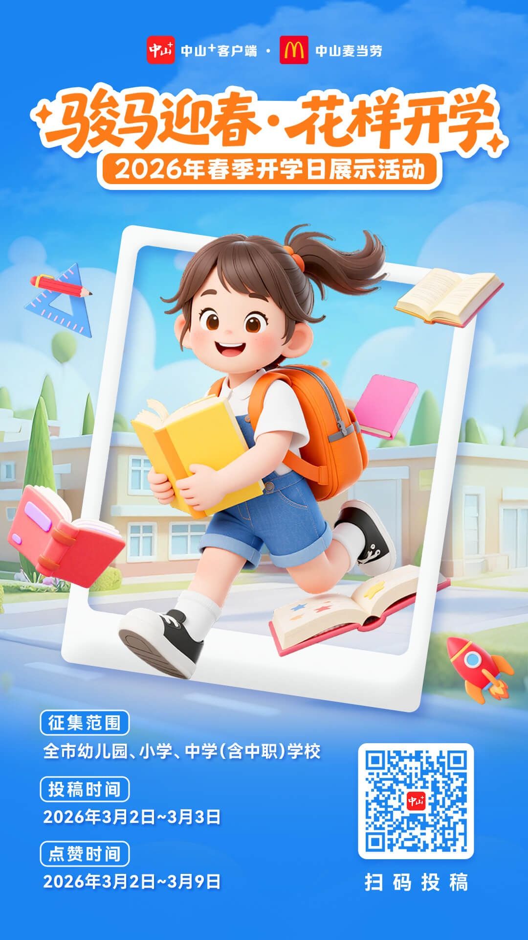 由中山唯一官方新闻客户端“中山+”联合中山麦当劳共同举办的“骏马迎春·花样开学”2026春季开学公益活动,今起正式开启预热。作为“中山+”连续多年打造的开学季王牌活动,它不仅是开学日的“记录者”,更是校园风采的“展示台”,既定格全市各校开学的精彩创意与温暖瞬间,更为学校展示教育特色、传递办学理念的提供了绝佳窗口。往届已有超130家学校踊跃参与,累计280万人次浏览、130万人次投票点赞,堪称中山开学季顶流活动。
