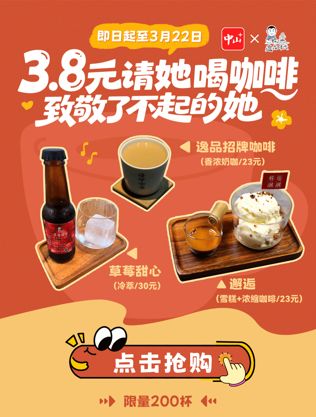 逸品时光咖啡馆是中山最早的自家烘焙手冲咖啡老店之一,本次联合“中山+”推出三款福利咖啡,一款邂逅咖啡,让你遇见温柔;草莓甜心冷萃,是专属你的春日浪漫;招牌咖啡,经典醇厚。三款咖啡任选其一,只需3.8元+38积分,数量有限,先到先得!
