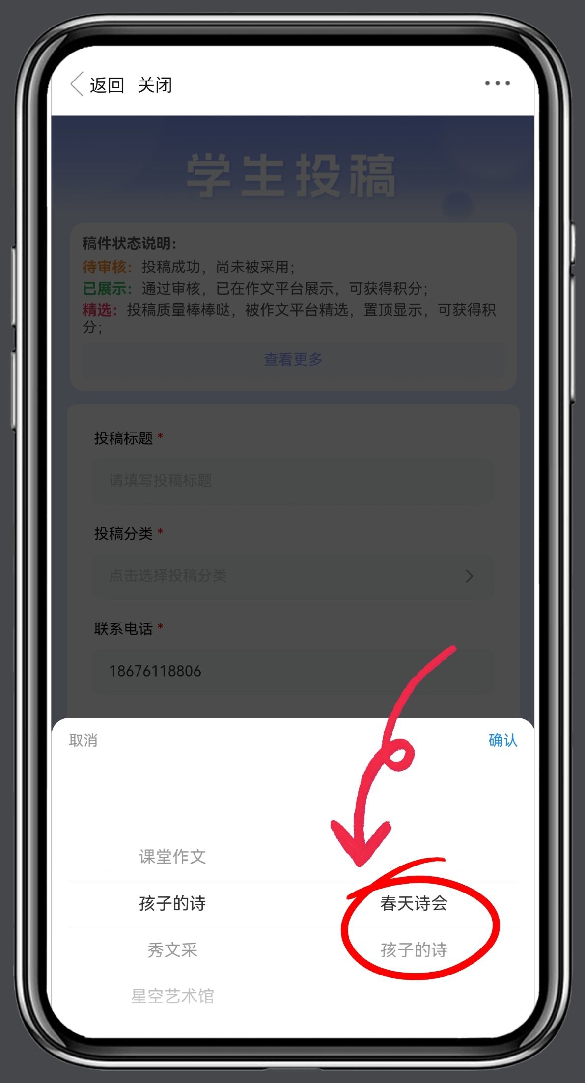2. 投稿标题请标注“春天诗会”,如:(春天诗会)春天的来信;投稿分类请选择“孩子的诗”→春天诗会。