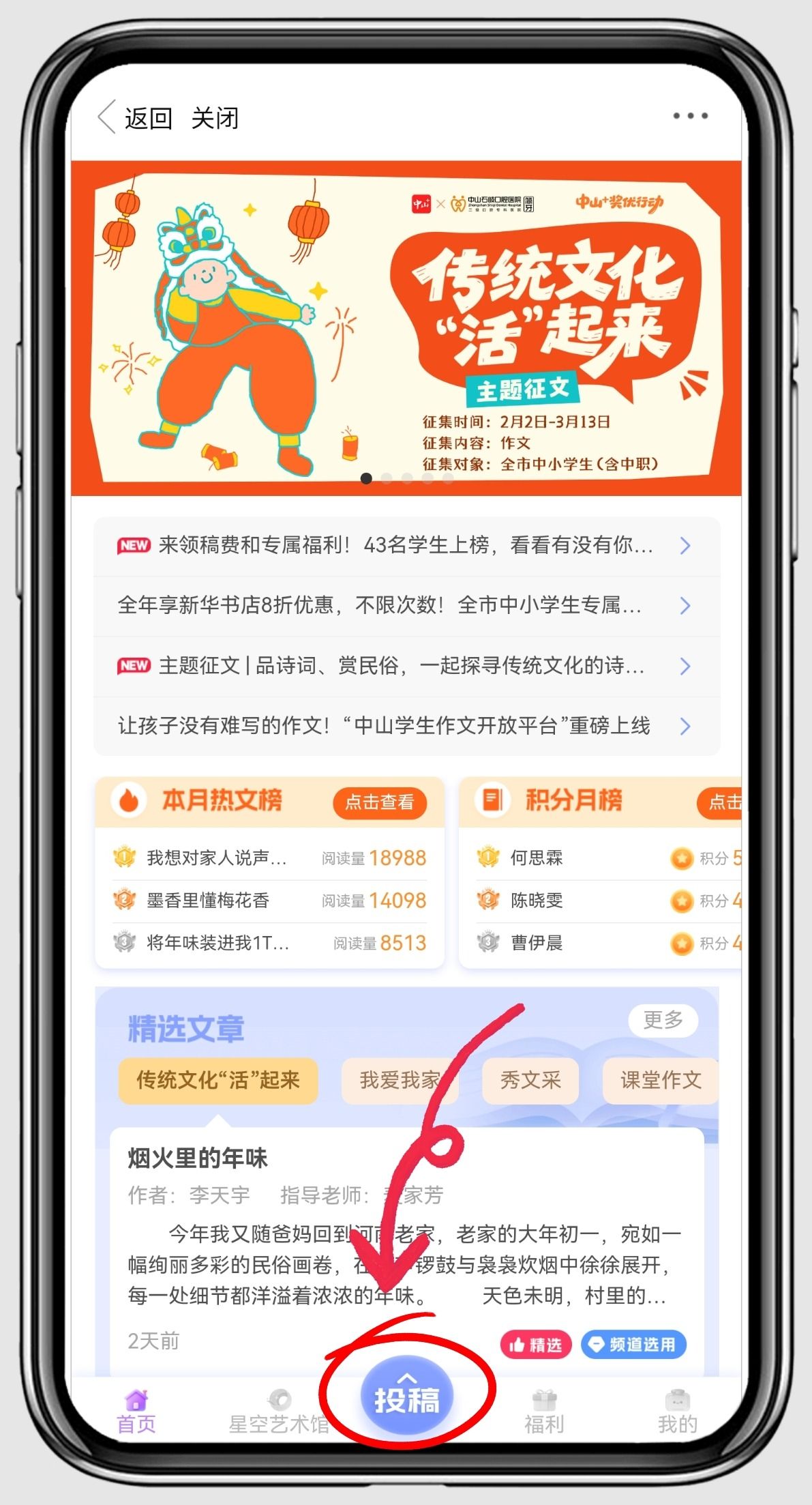 1. 点击上面图标进入“中山学生作文开放平台”,点击底部“投稿”按钮去投稿。