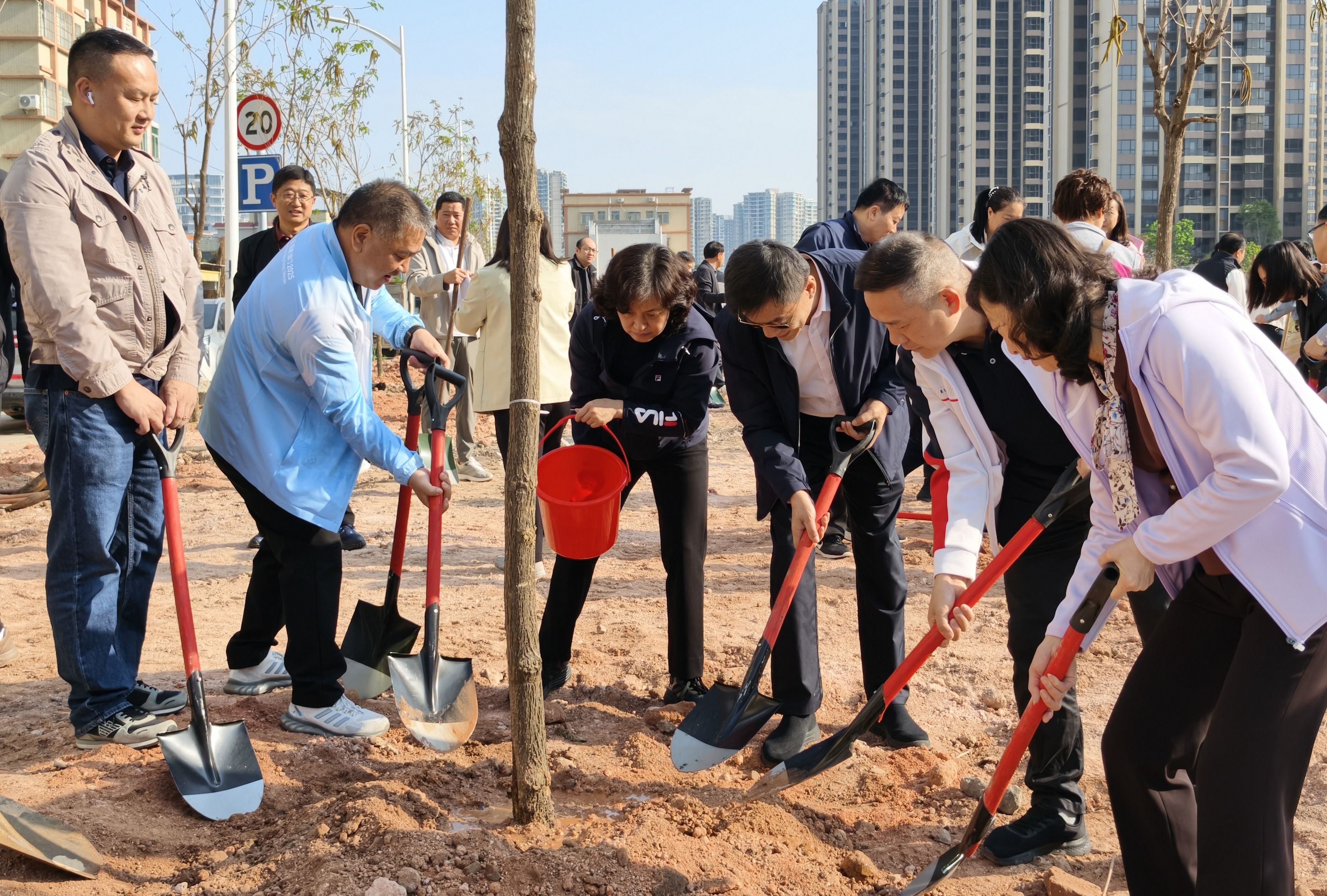 植树现场,大家分工协作、干劲十足,挥锹铲土扶苗培土、提水浇灌,共栽下黄花风铃木56株。新种植的“同心林”错落有致、迎风挺立,为道路景观增添了一片生机勃勃的新绿。此次活动进一步增强了统战成员的生态责任意识和绿色发展共识,为高质量推进全域绿化美化、打造人与自然和谐共生的美丽中山注入了统战力量。