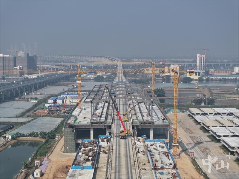 去年4月,中山西站顺利完成桩基施工,是深江铁路项目首个完成站房桩基施工的车站,工程进度领跑全线。目前,该站已完成站房跨线雨棚钢结构吊装,主体结构完工90%,后续将稳步推进主体施工收尾工作。