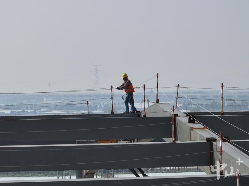 上午10时,记者走近深江铁路中山西站建设工地,抬眼望去,车站的雏形已然清晰。几名施工人员身着安全服、系紧安全锁套,在悬臂吊车的精准协助下,稳稳站立在跨线雨棚钢结构架之上,手持焊枪专注作业。