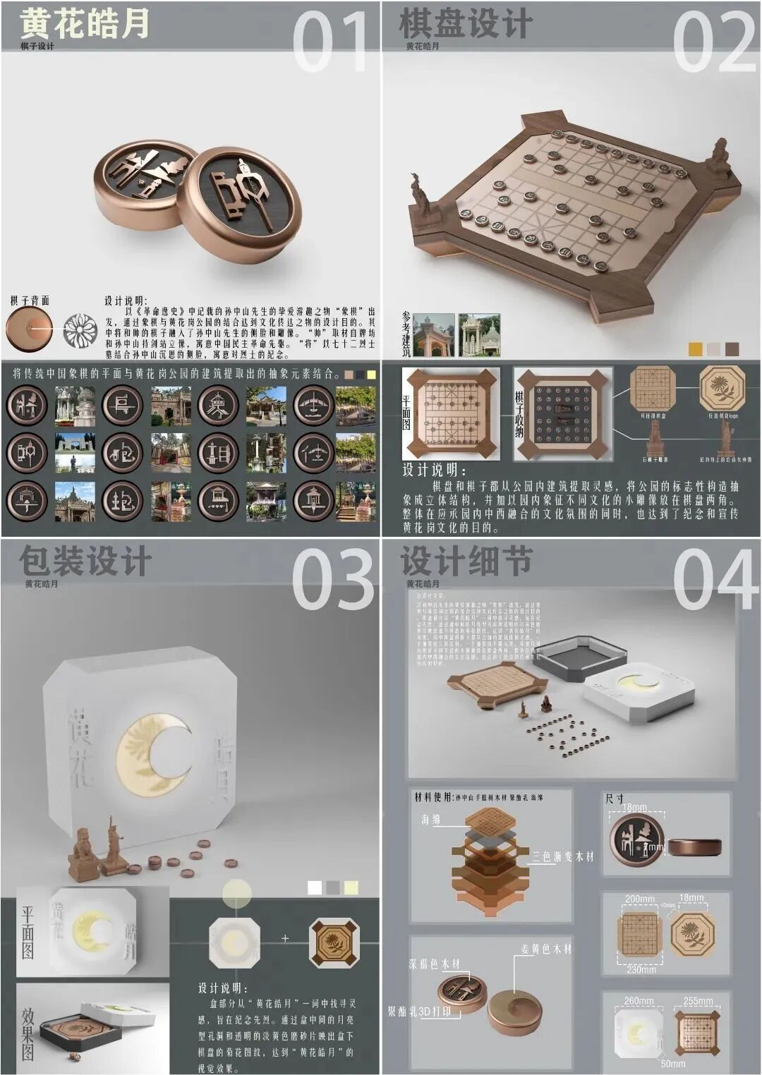 记者看到,获奖者中也不乏中山人。就读于广州美术学院的黄兆熙便是其中一位,他的团队以作品《黄花皓月》获优秀奖。“孙中山是我从小就非常熟悉的历史名人。我们希望通过这件作品,引发更多年轻人对他的兴趣,继而深入了解相关历史。“据介绍,《黄花皓月》是一套中国象棋的棋盘,它从《革命逸史》中记载的孙中山挚爱的象棋出发,从黄花岗七十二烈士墓园的建筑造型中提取抽象元素,融入棋面符号。主设计师林灏宏透露,最初设计取自战争符号,但指导老师提示,有可能误读了孙中山的精神,“通过深入学习,我们了解到,孙中山更提倡博爱、和平与发展,最后将它调整为寓意缅怀先烈的建筑符号。”