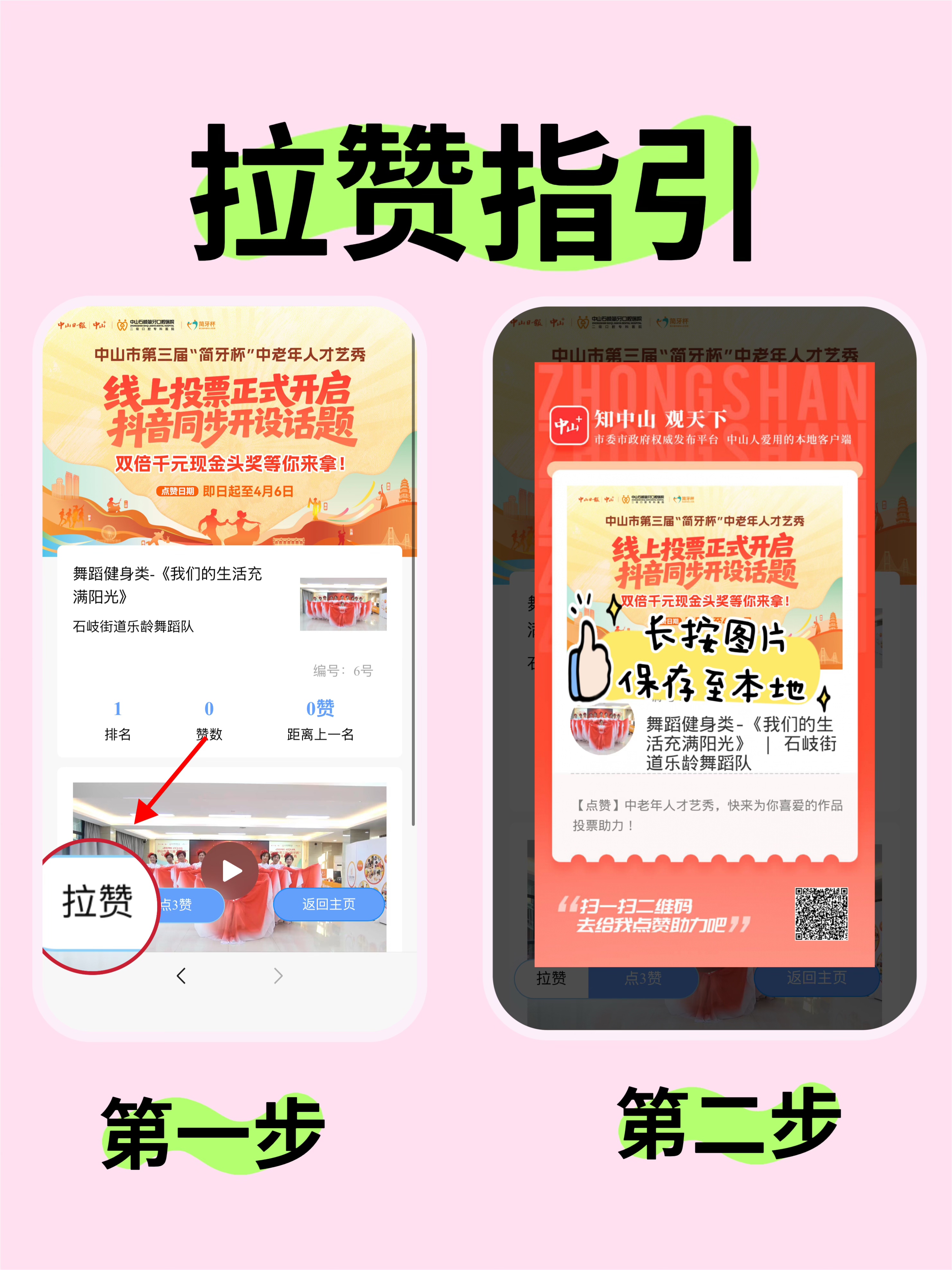 1.文案格式“我是《东区xxxx队伍》/个人名字,我们正在参加中山市第三届“简牙杯”中老年人才艺秀,请大家为我们点赞助力!#中山市第三届中老年才艺大赛 。”