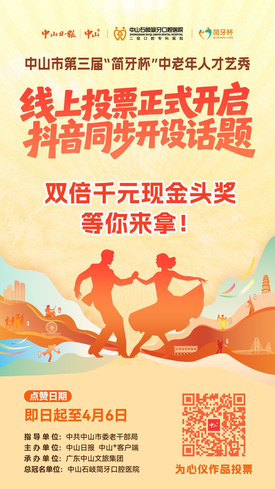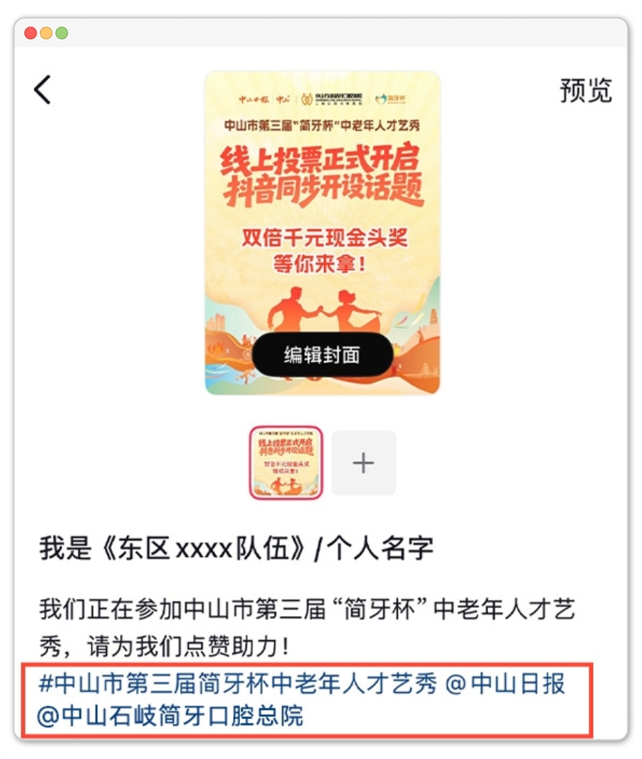 2.发布必备要求:必须添加话题:#中山市第三届中老年才艺大赛;必须在作品中@中山日报 官方抖音号、@中山石岐简牙口腔总院 官方抖音号。