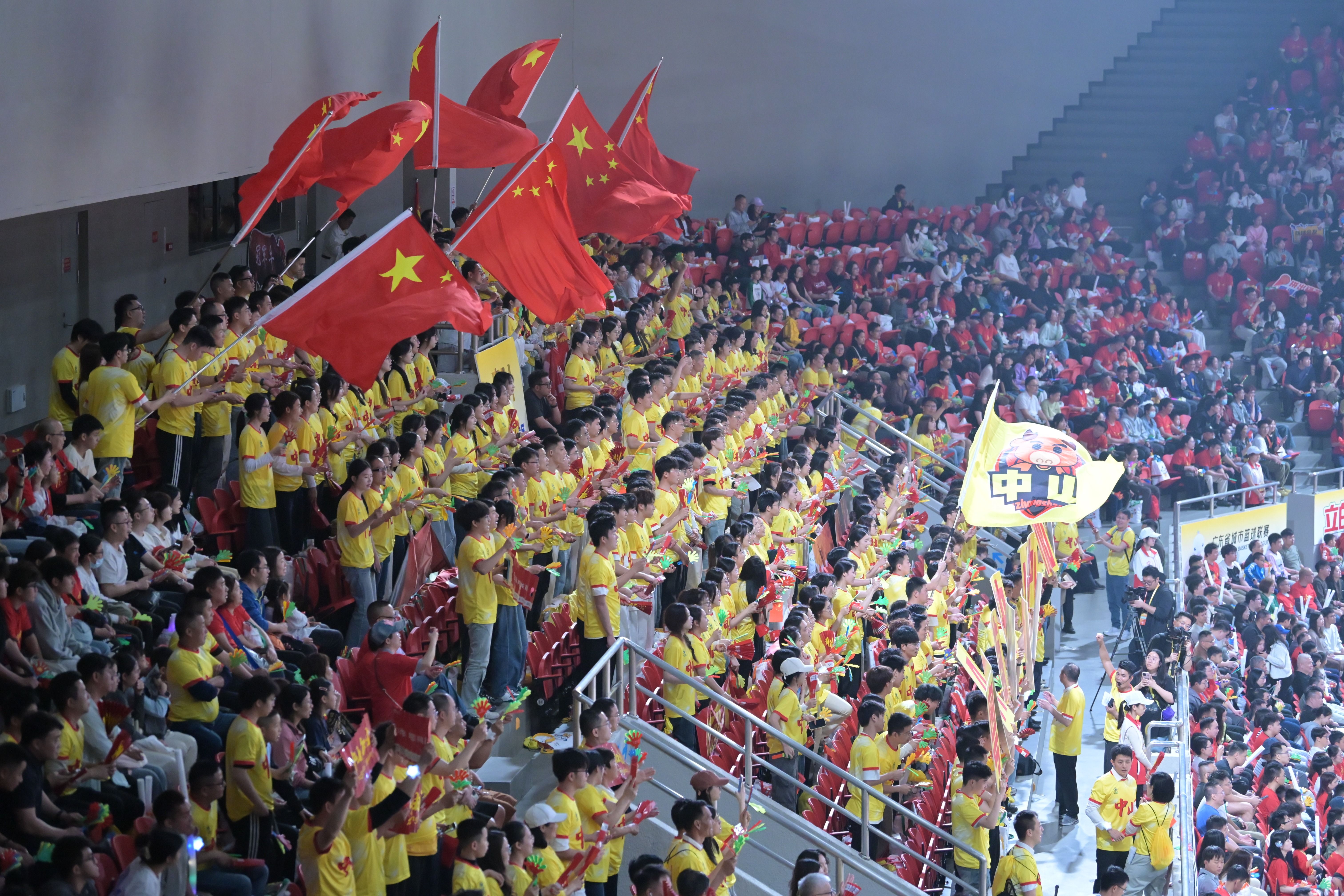 现场,可容纳近万名观众的场馆座无虚席。赛场两侧看台氛围浓烈,形成鲜明对比。中山队球迷身着黄色应援服,手持红底黄字中英双语“中山加油”应援牌,轮番合唱《男儿当自强》《团结就是力量》《爱拼才会赢》等歌曲为球员鼓劲,整齐有节奏的“中山加油”助威声浪此起彼伏。广州队球迷统一身穿红色应援服,手握拍手器与充气打气棒,手举“智慧之都”纸牌和亮着“为广州打CALL”的各式口号应援灯牌,喊着“广州无得顶”的粤语口号。现场红黄两色海洋交织。