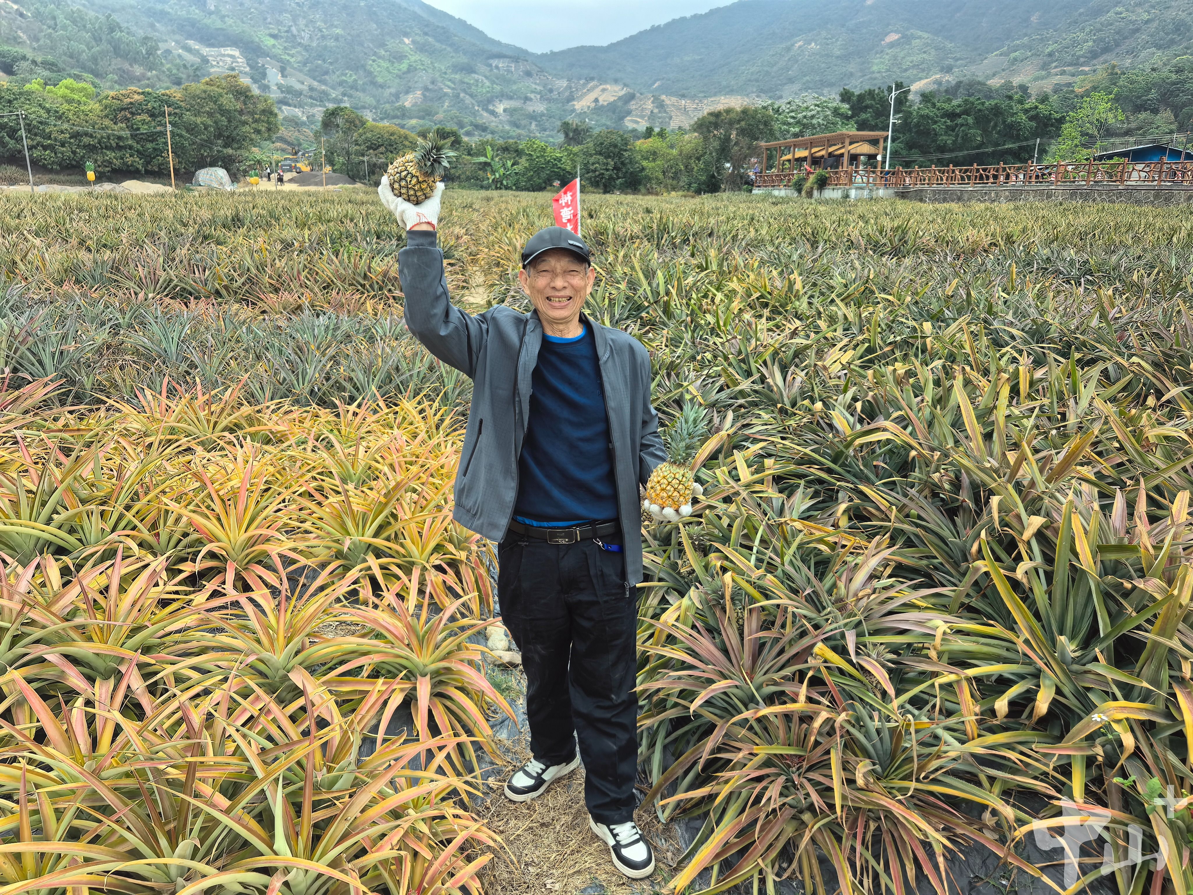 在神湾菠萝产业园,神溪村大果园菠萝采摘基地处于入口处较为显眼的位置。该基地的负责人李标种植了20多年的菠萝,被广东省认定为“广东省乡土专家”,也被神溪村村民誉为“菠萝宣传大使”。他种植了70亩菠萝,其中引进的新品种最多时达到28种。