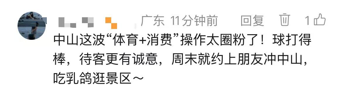 多维度的优惠福利,让人体会到中山的满满诚意,相关社交平台评论区,早已被广州网友的留言刷屏,大家纷纷为中山的大方与用心点赞。有网友留言称,中山有诚意,有魄力,有底气,有胸襟,是粤港澳大湾区大有可为的光荣之城。也有网友说,中山队在赛场上敢打敢拼的劲头让人印象深刻,赛场下这座城市的待客之道也很暖心,已然开始规划中山打卡之旅,想要沉浸式感受中山的美景与美食。