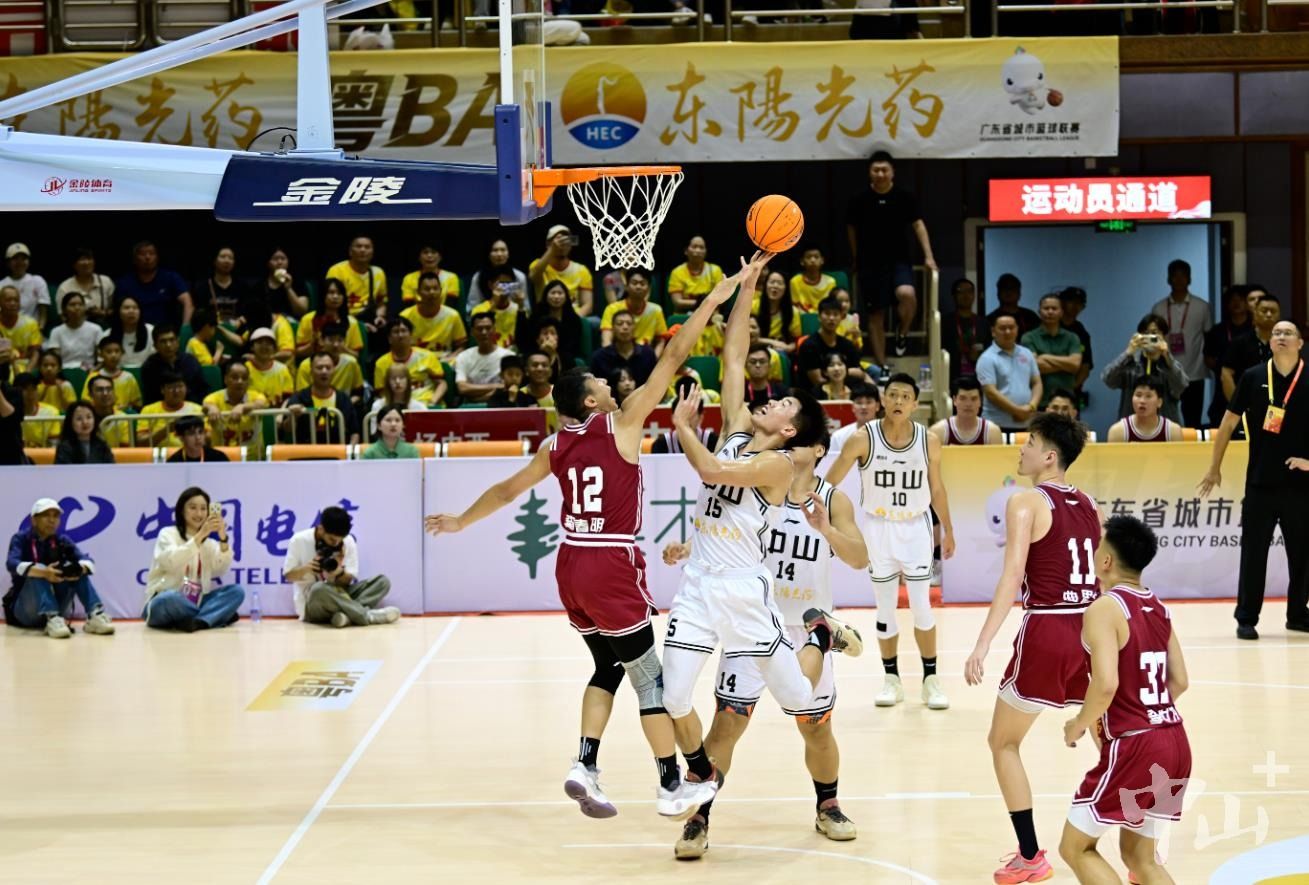 中山队(白色球衣)在主场以96:74击败茂名队(红色球衣)。