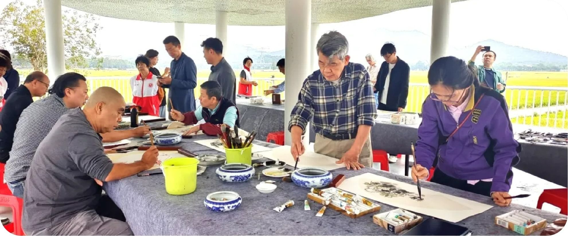 与此同时,肖伟多次组织书画家深入曹边村采风写生,让艺术家们走进稻田、穿行古巷,从乡土烟火中汲取创作灵感,先后创作了二十余幅乡土题材书法、国画作品,并无偿捐赠给村委会,用于村庄公共空间的美化装点。过程中,艺术家们在乡村沃土中找回了艺术创作的初心,与乡村肌理深度交融,与侨村文脉同频共振,在这片乡土之上扎下了深根。