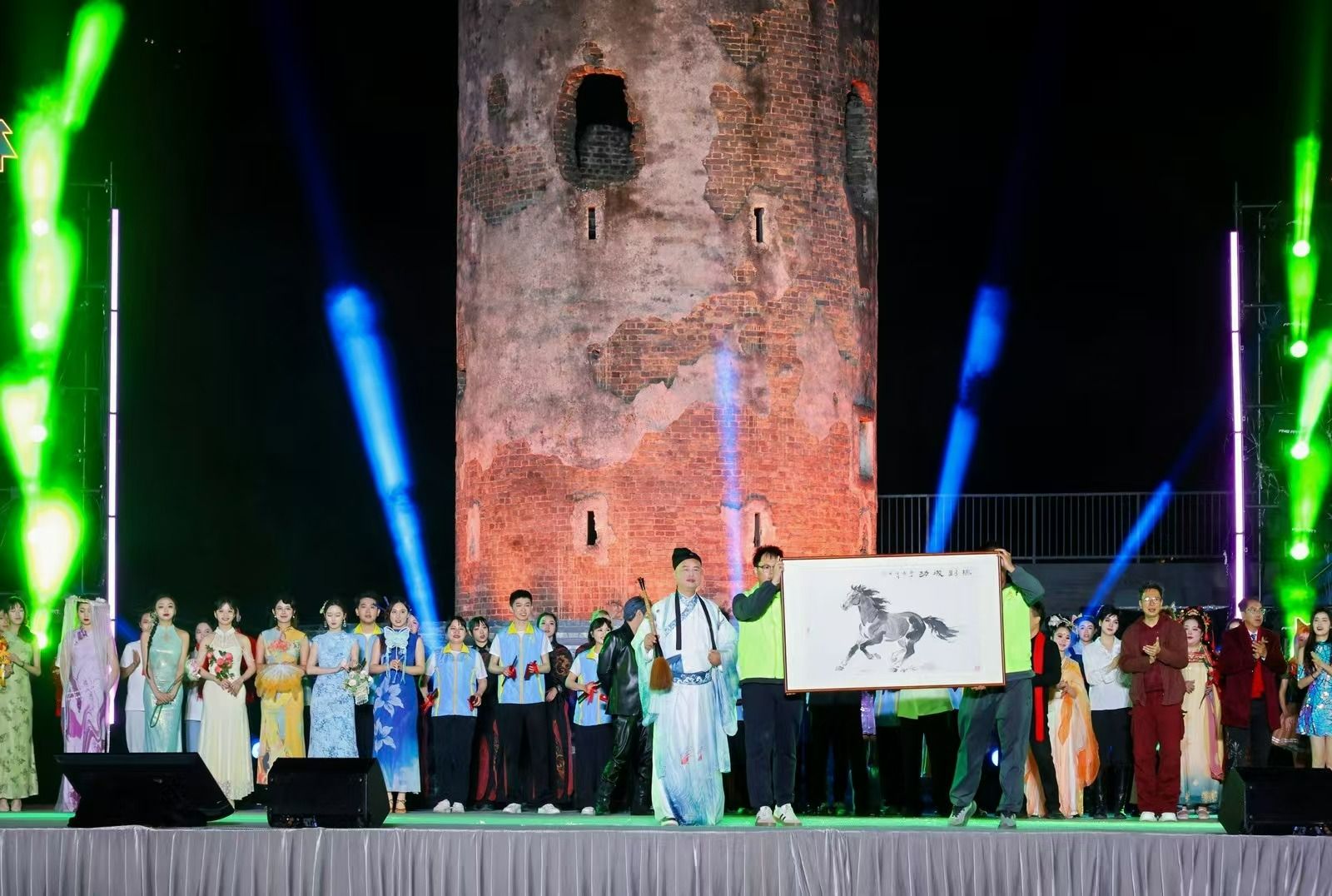 2月8日,曹边炮楼周边人头攒动,“曹边夜宴——马跃腾飞迎新村晚”在这里上演。主舞台上,《神笔马良》创意开场——舞台上,肖伟泼墨走笔,与音乐家协会的二胡演奏联动。瞬间,一匹骏马从纸上跃出,奔向大屏幕,踏过之处乡村大地渐变新颜。村民观众对这位“文化村长”的点睛之笔感到十分惊喜。