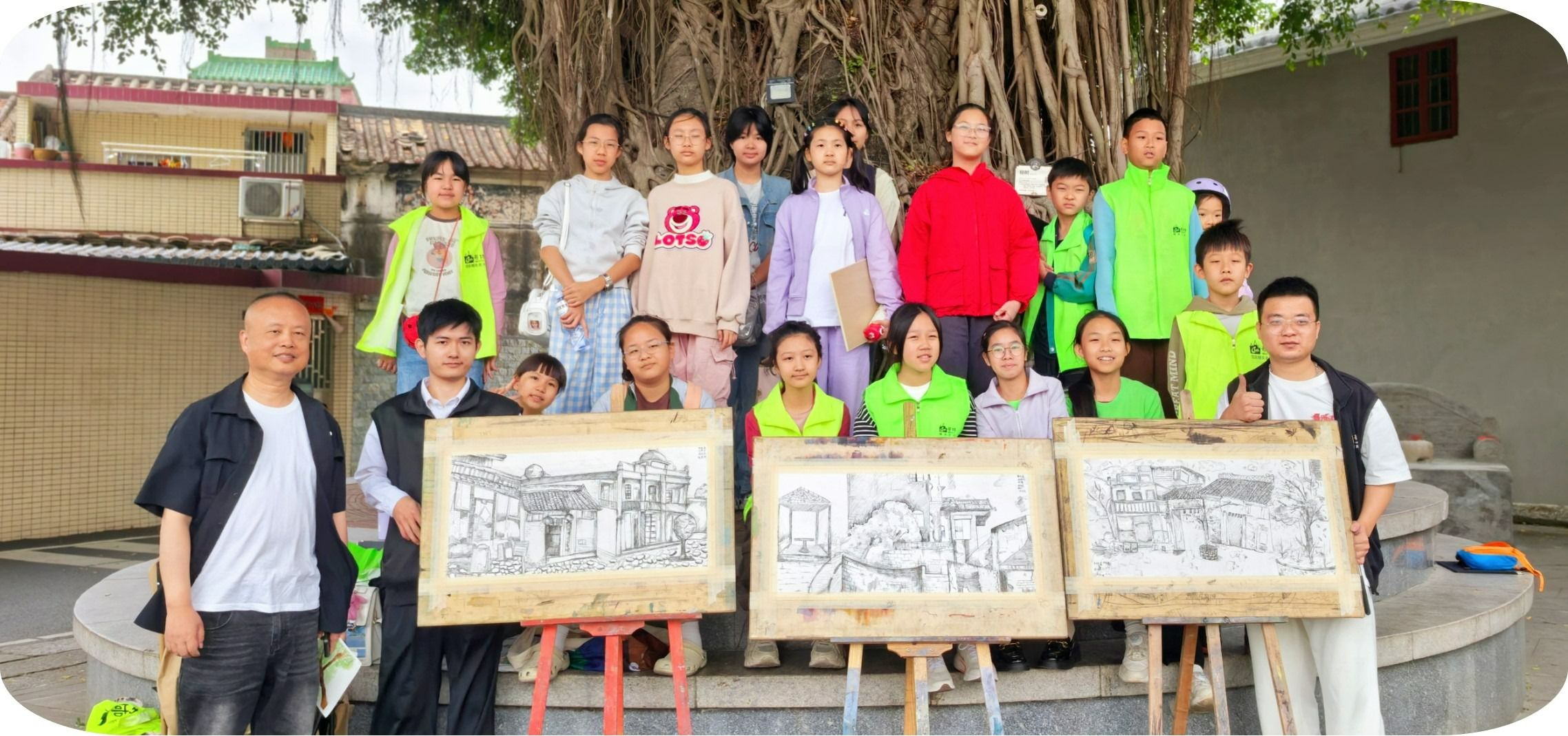 怀揣着这份初心,肖伟联合中山美术馆三位特聘人才,正式启动“童笔绘村”计划,开设儿童油画棒公益课堂,免费带领百余名少年儿童走进曹边学校、百年碉楼、金色稻田,用稚嫩的画笔描绘家乡的一景一物、一砖一瓦。