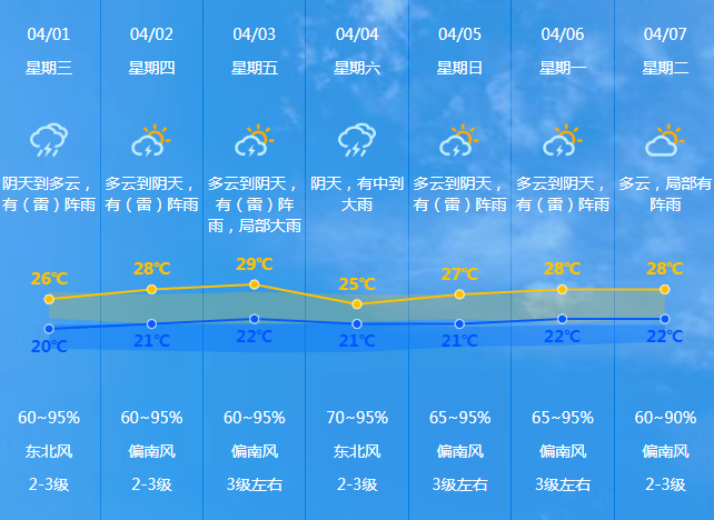 本周中后期我市降雨频密,其中4月1-2日有阵雨或雷阵雨;3-4日受高空槽和切变线影响,再有一次中到大雨、局部暴雨降水过程;展望5-6日仍有明显降雨。