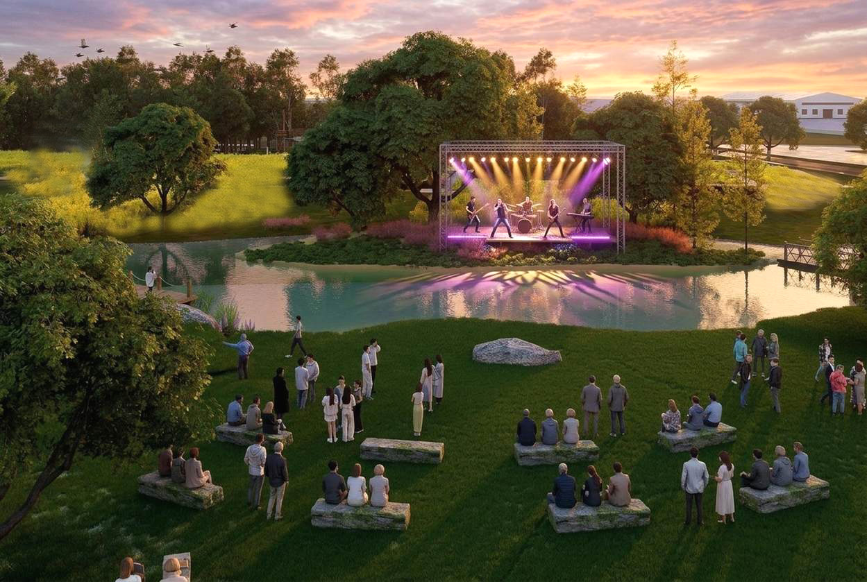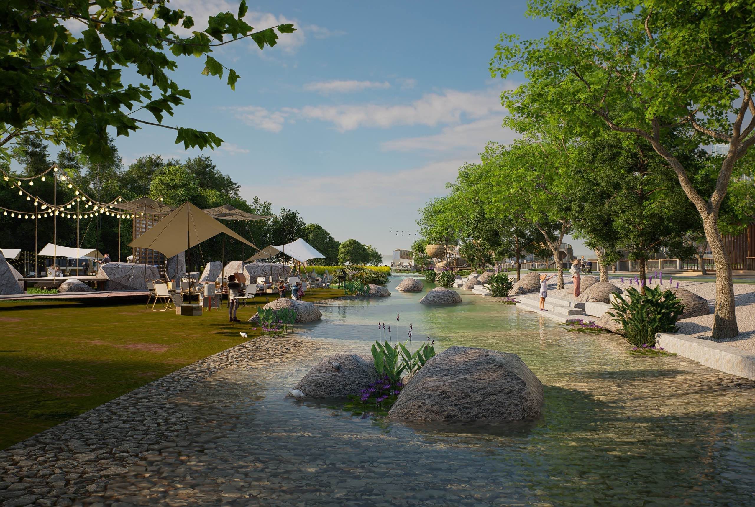 在功能布局上,城市会客厅拥有约30亩的大草坪区域,处于水中央的“表演岛”依地势而建,通过石桥跨灌溉渠与大草坪相连,打造田野间的露天舞台,“这里可以举办乐队演出、名家讲坛,参照港澳维多利亚论坛的形式开展交流活动,同时也能满足群众性文化活动的需求,让市民在家门口就能享受文化盛宴。”魏德鑫介绍说。此外,林间淋溪版块,营造浅水嬉戏空间,为儿童提供安全的亲水游玩区域。