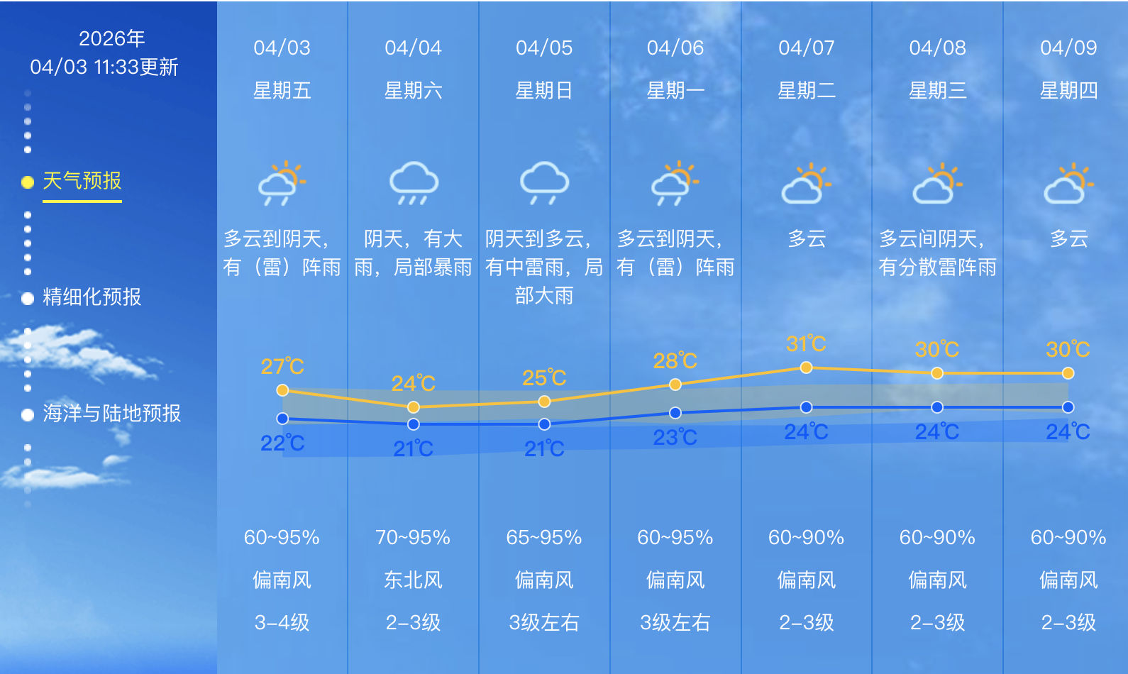 4月6日:23~28℃,多云到阴天,有(雷)阵雨。