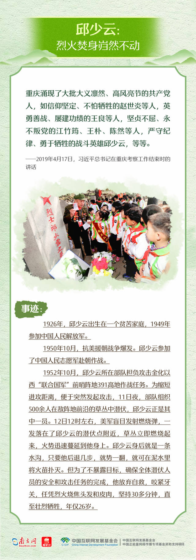 “天地英雄气,千秋尚凛然。”习近平总书记指出,对一切为国家、为民族、为和平付出宝贵生命的人们,不管时代怎样变化,我们都要永远铭记他们的牺牲和奉献。清明节,让我们重温习近平总书记缅怀革命先烈以及和平年代英雄们的深情话语,一起学习英烈事迹,赓续精神血脉,凝聚前行力量。