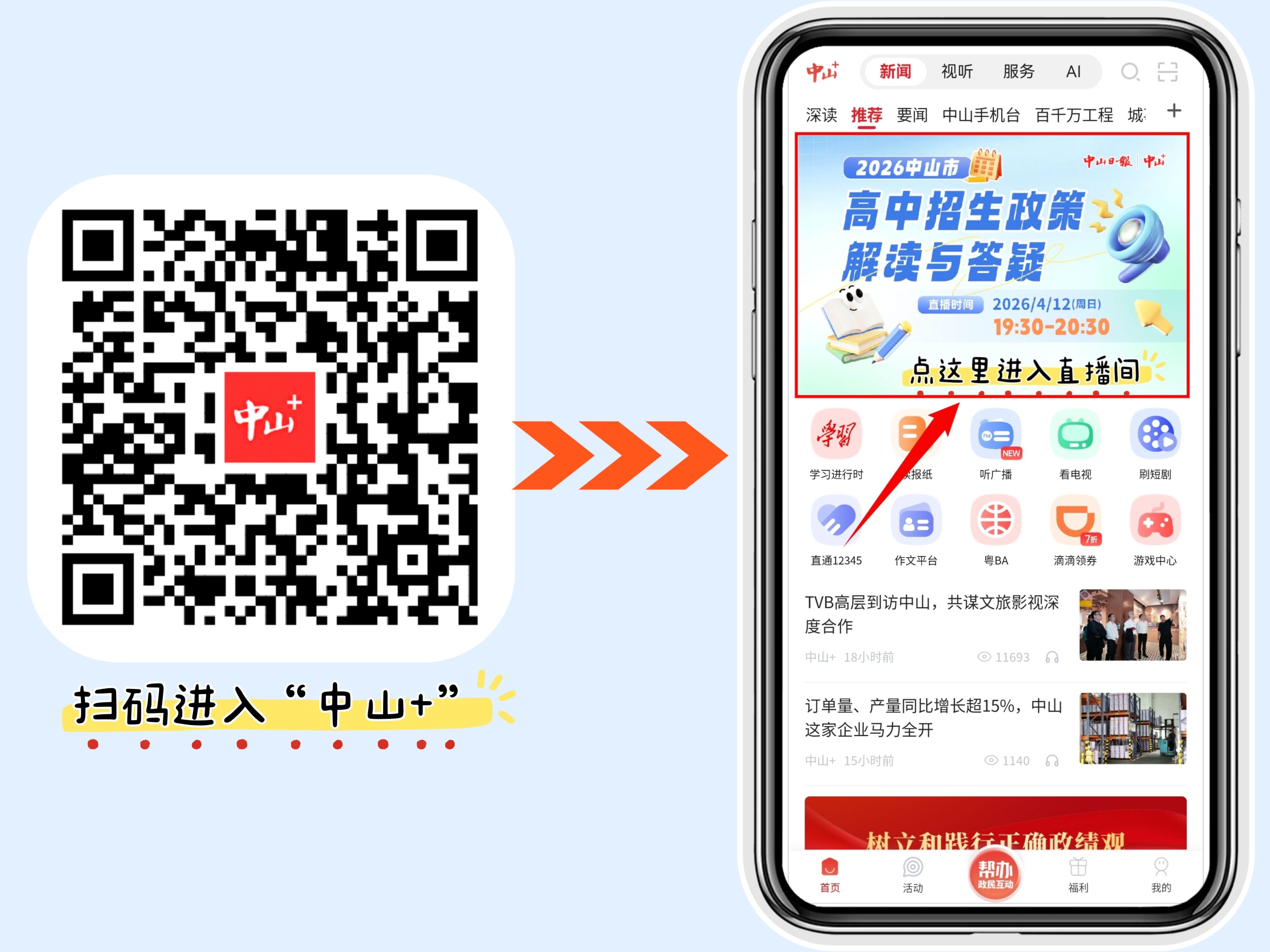 方式二:进入“中山+”观看直播更流畅。(扫码下载“中山+”,在新闻首页顶部进入直播间。)