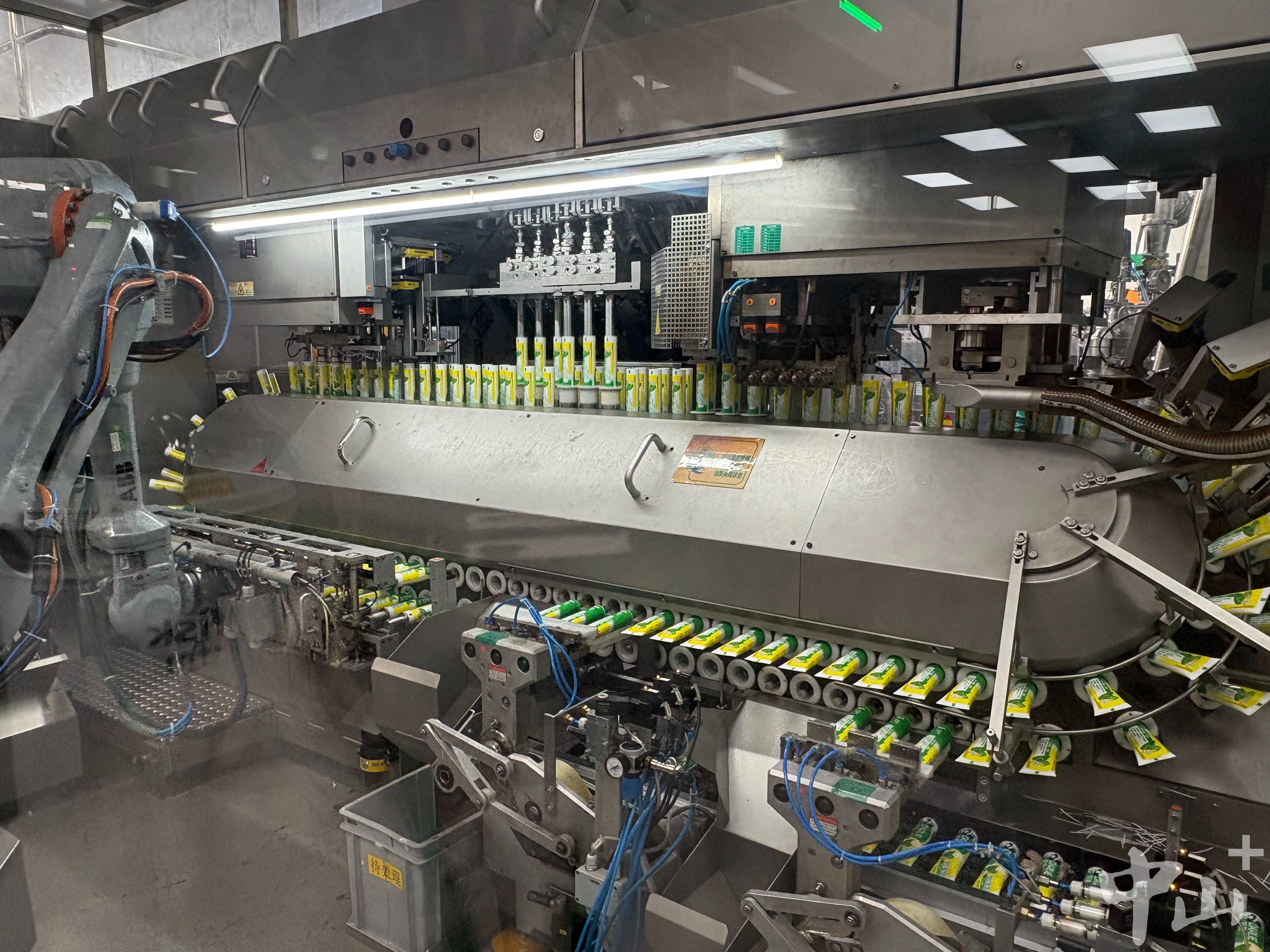 生产车间内,机械手臂精准运转,一条生产线每分钟可生产500多支牙膏管,约10条生产线同时运转,偌大的车间里只需少数技术人员专注监控数据屏幕。
