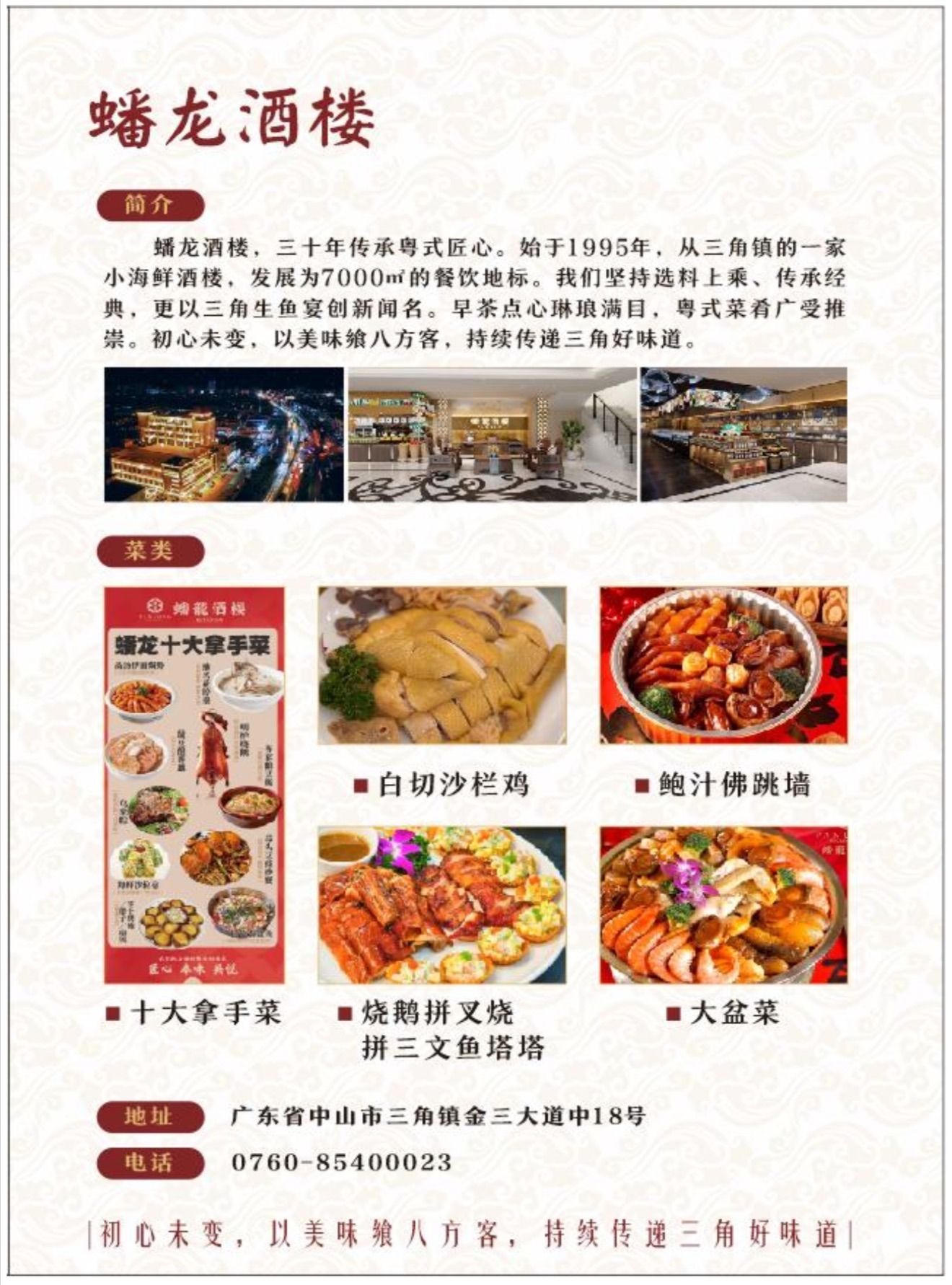 记者了解到,除了蟠龙酒楼、维港喜宴,三角镇还有多家餐饮名店,推出了不少特色的沙栏鸡菜品:三角花果山庄以沙姜葱沙栏鸡为招牌,鸡肉皮爽肉滑、咸鲜入味;华仔农庄的桑拿沙栏鸡,用桑拿锁鲜,最大程度保留鸡肉的鲜嫩;袁执食店的鱼焖沙栏鸡,鲜香味浓。据了解,三角镇以及中山还有不少地道沙栏鸡美食值得探寻,欢迎广大市民游客前来品尝。