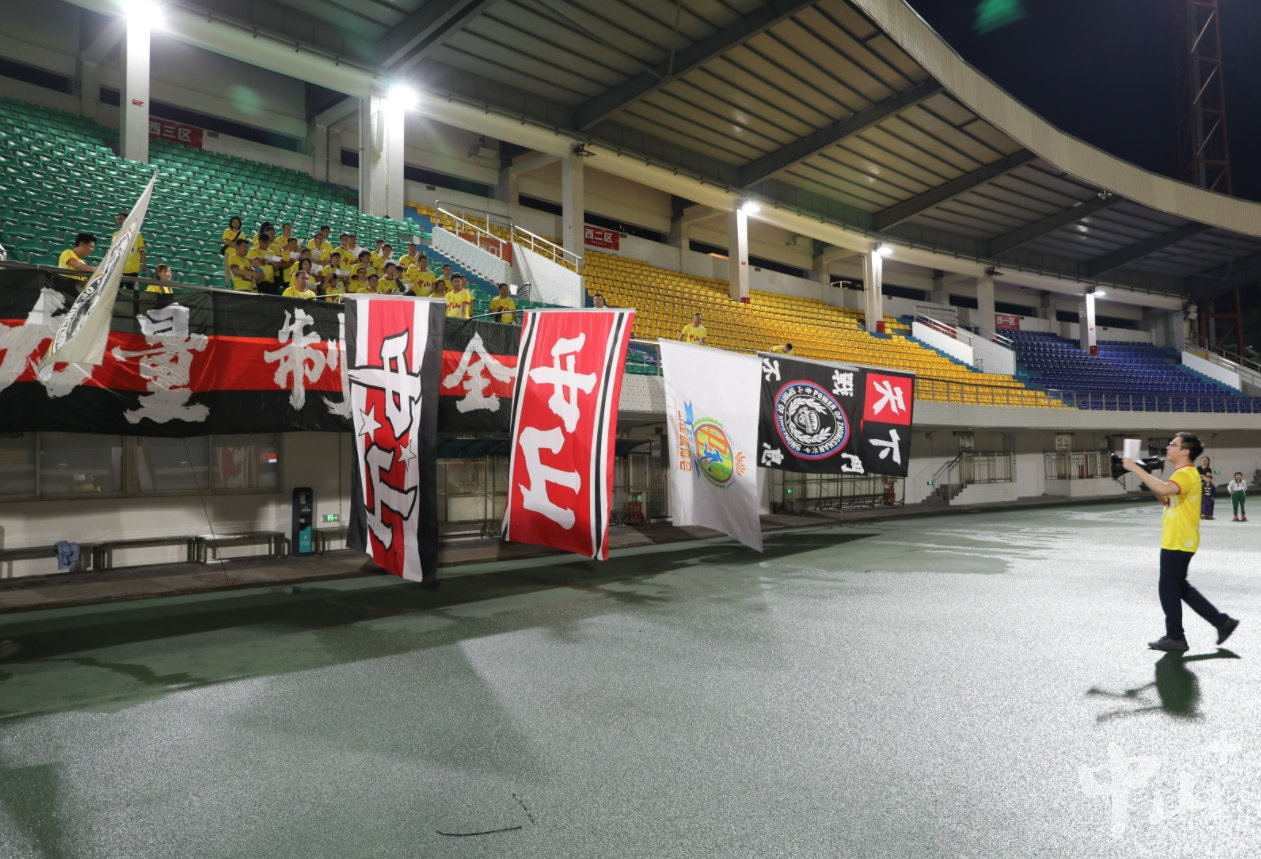 当晚的体育场内灯火通明。看台上,各类定制旗帜整齐排布,印着“POWER OF ZHONGSHAN”的中山球迷联盟主旗、红底白字的“中山”主题条幅,以及“香山力量 制霸全场”等横幅随风舒展,红、黑、黄三色配色与球队主场球衣风格相得益彰。