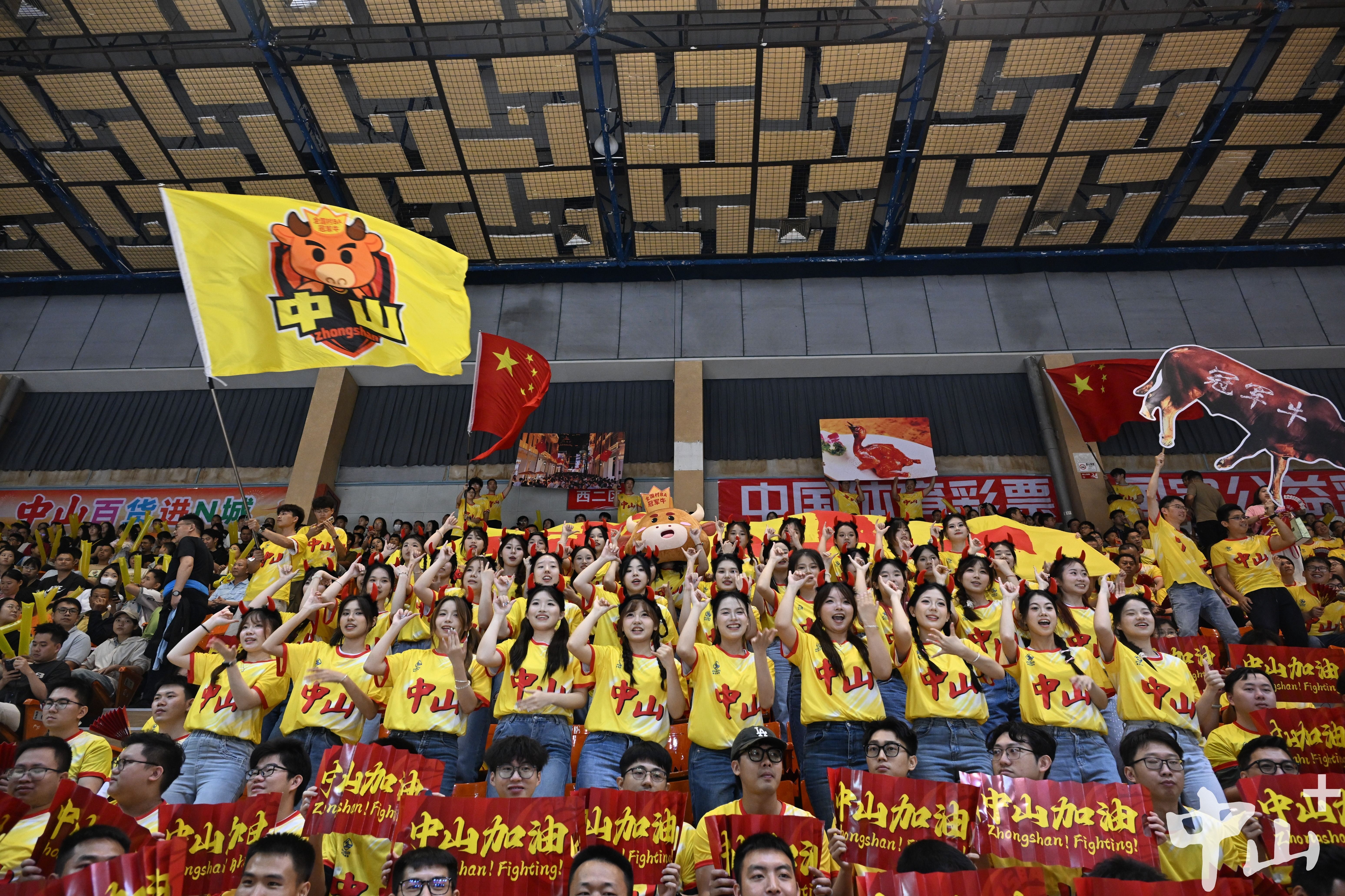 赛事尚未开始,馆内已是一片温暖的“黄色海洋”。由全市各行各业球迷组成的拉拉队,身着统一黄色应援服,手持助威道具、高举“中山未赢够 中山再加油”等横幅,早早就位为球队蓄力,嘹亮的口号响彻场馆,为球员注入满满斗志。